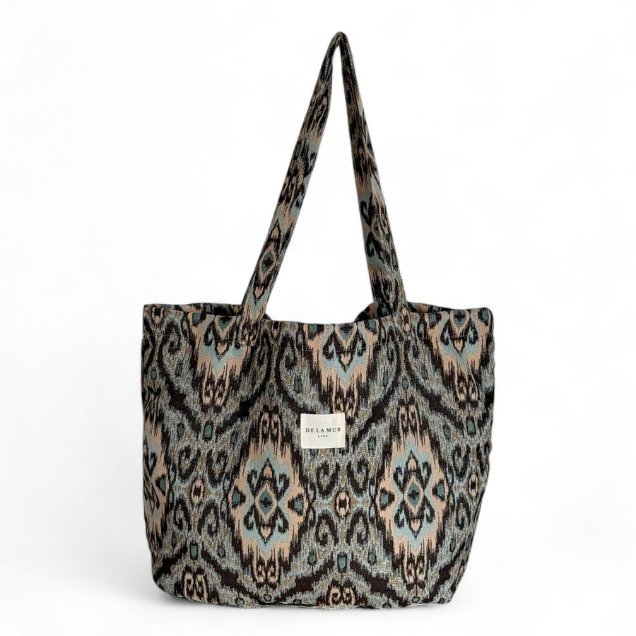Bolsa shopper grande con asas para llevar al hombro. Con tejido grueso de jacquard con estampado geométrico en tonos gris. Para su correcto mantenimiento se aconseja lavarlo en frío a mano y no utilizar la secadora.