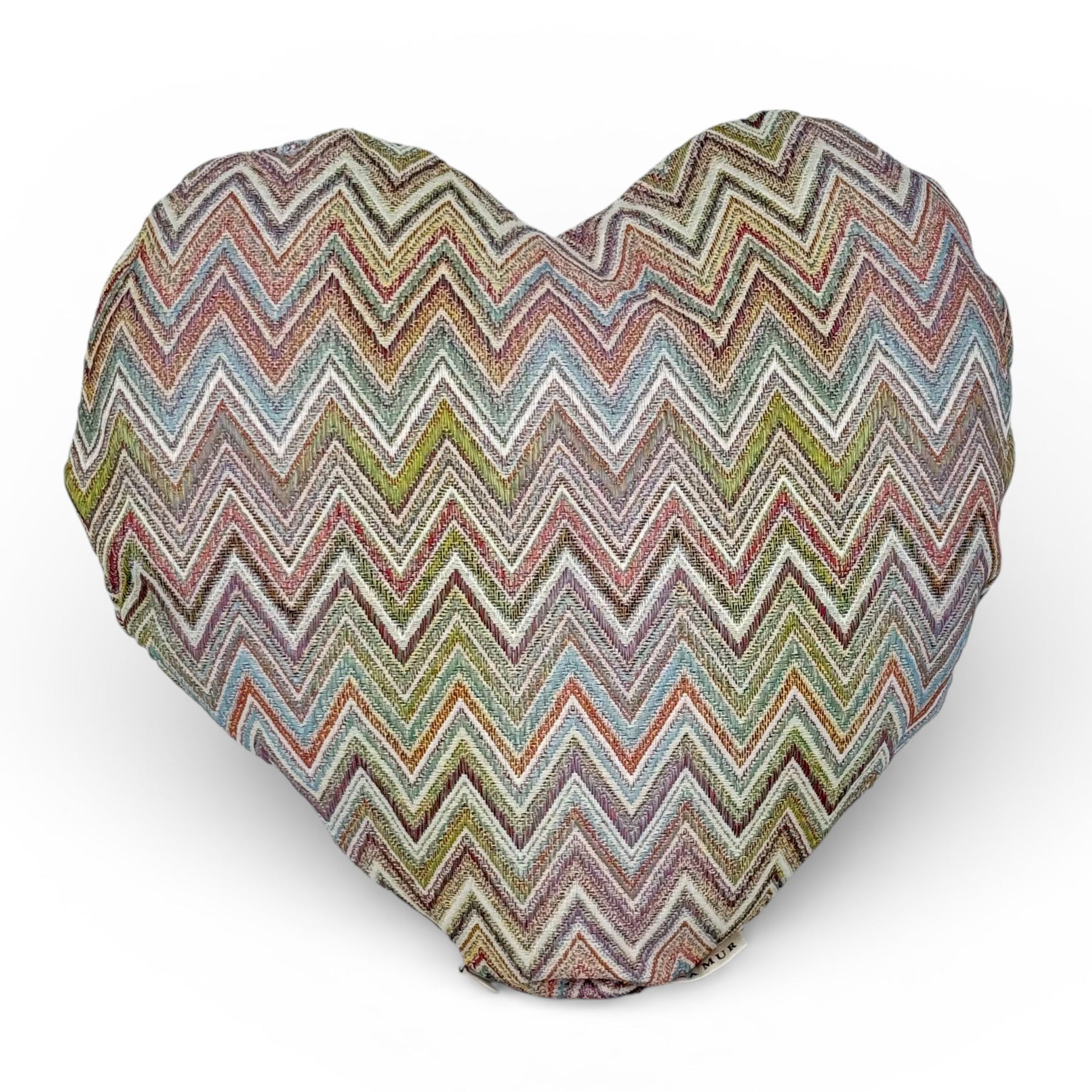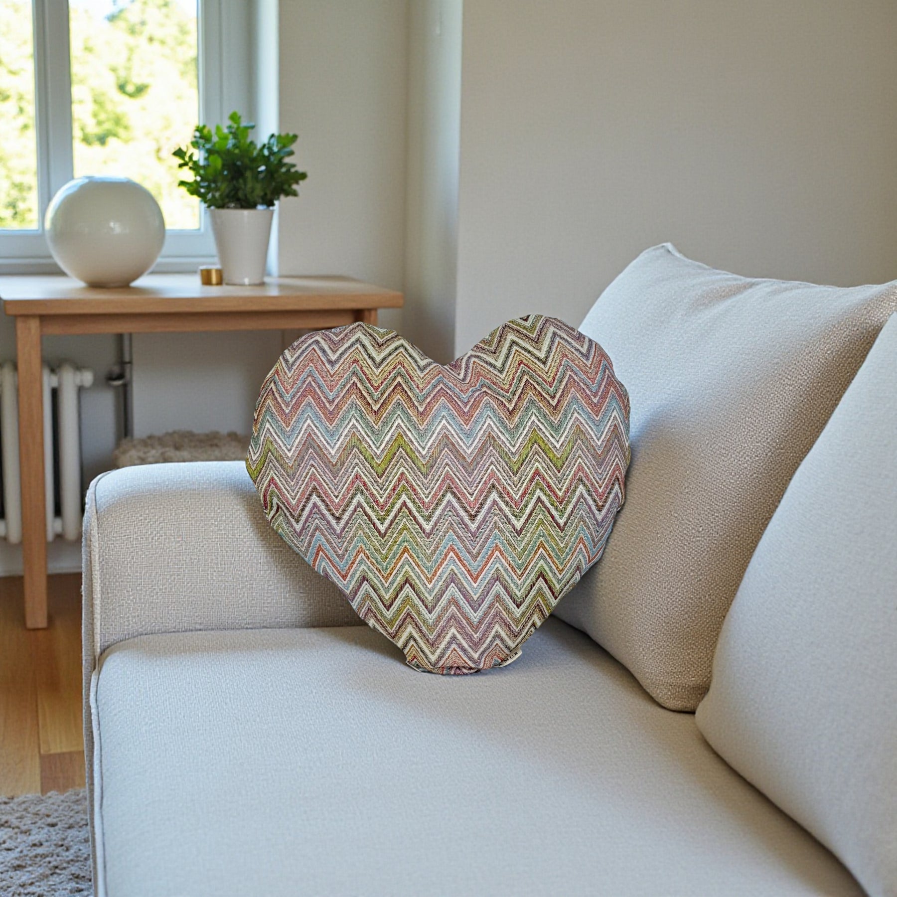 Cojín en forma de corazón con relleno, confeccionado en tejido grueso de jacquard 80% algodón y 20% poliéster de gran calidad con estampado de zigzag multicolor, delicado y original a la decoración del hogar.