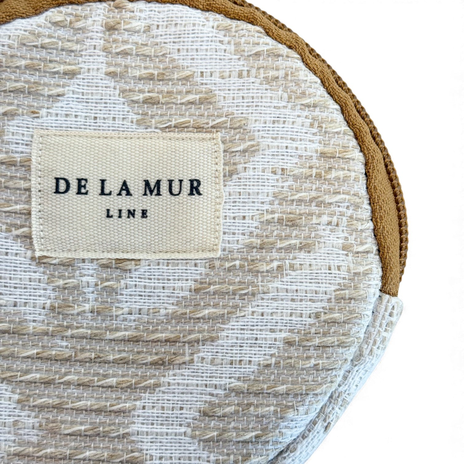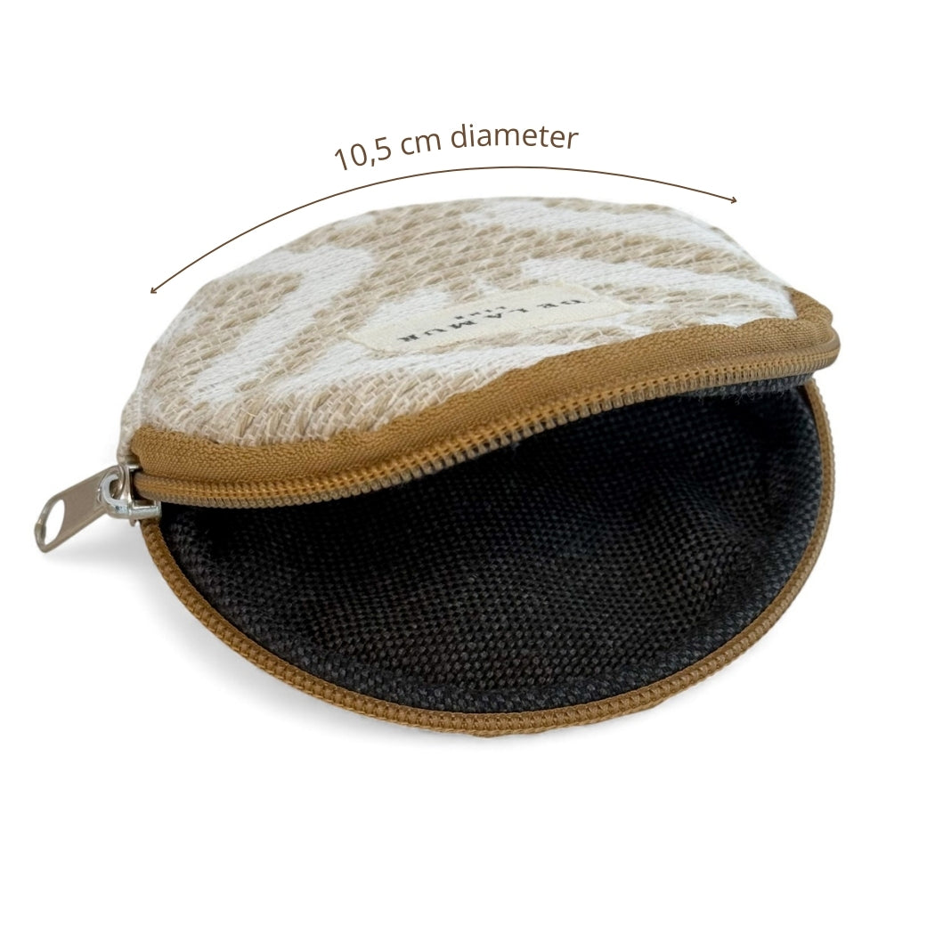 Monedero redondo con cremallera en la parte superior. Con tejido grueso de jacquard 80% algodón y 20% poliéster con estampado geométrico en tonos beige y crudo. Cada articulo puede tener una variación en el estampado, dependiendo de donde se haya efectuado el corte de la pieza. Forrado de tejido grueso de color gris en la parte interior. Para su correcto mantenimiento se aconseja lavarlo en frío y no utilizar secadora.