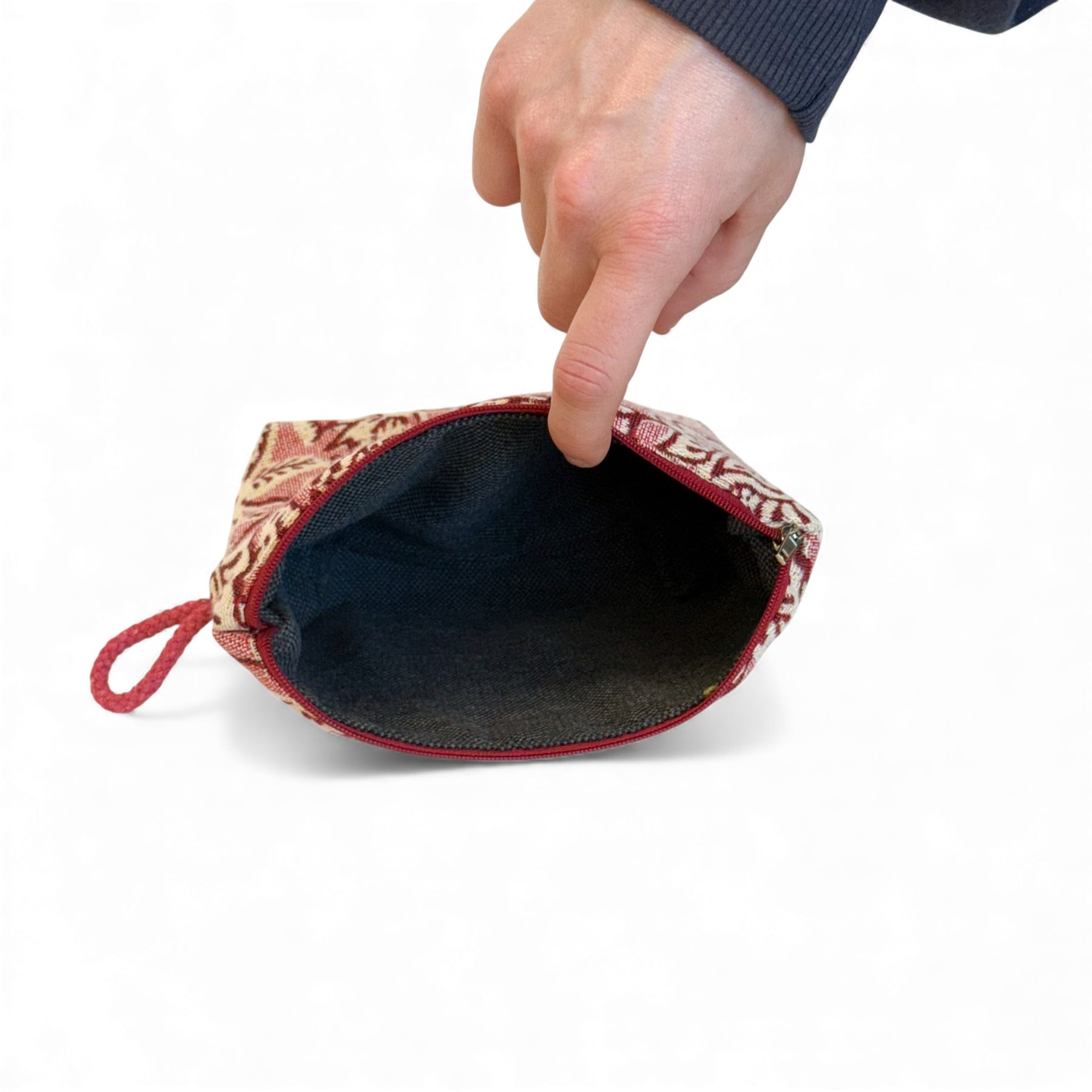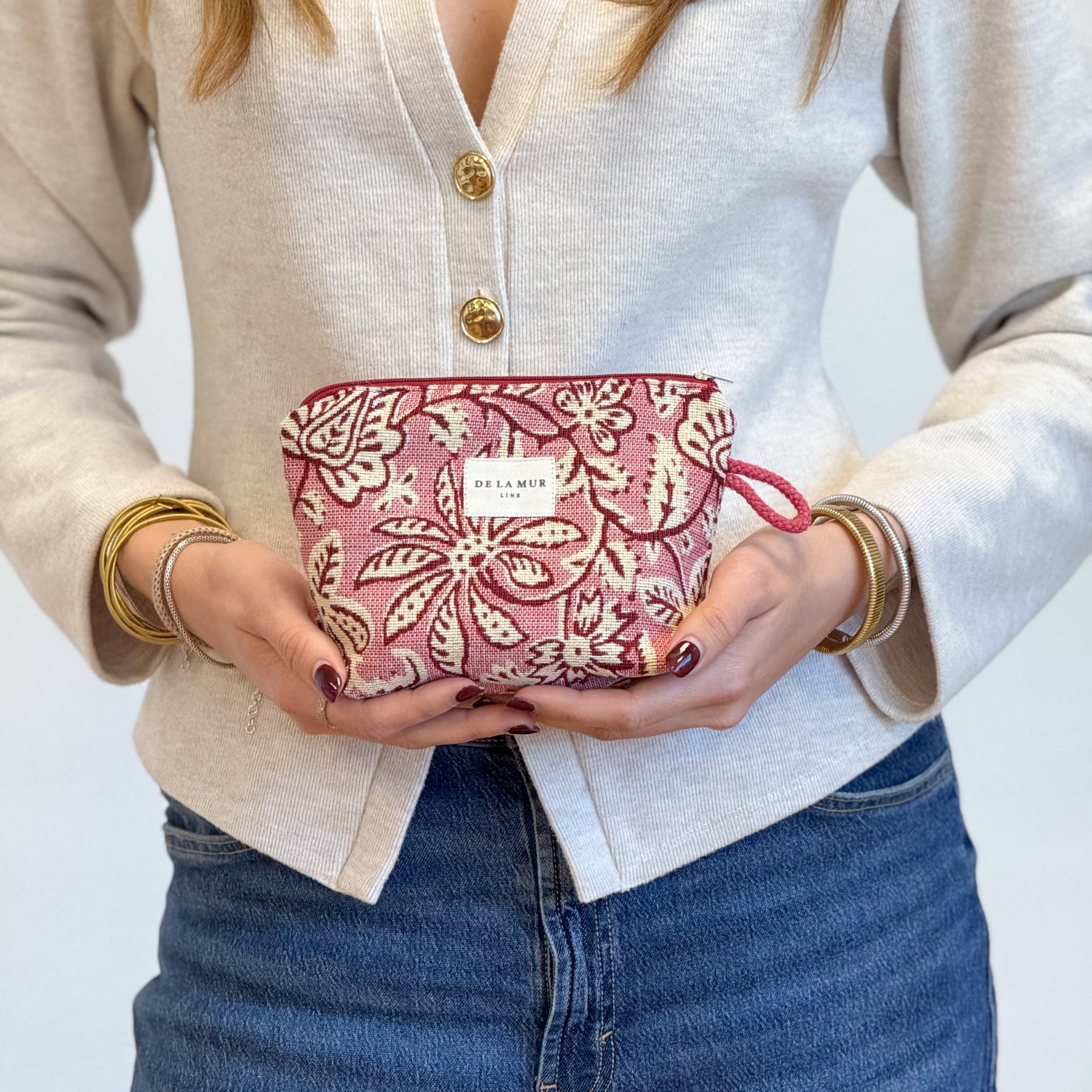 Neceser pequeño con cremallera en la parte superior y con asa lateral de cordón de color rosa. Con tejido grueso de jacquard 80% algodón y 20% poliéster con estampado floral en tono crudo sobre fondo rosado. Cada articulo puede tener una variación en el estampado, dependiendo de donde se haya efectuado el corte de la pieza. Para su correcto mantenimiento se aconseja lavarlo en frío y no utilizar secadora.