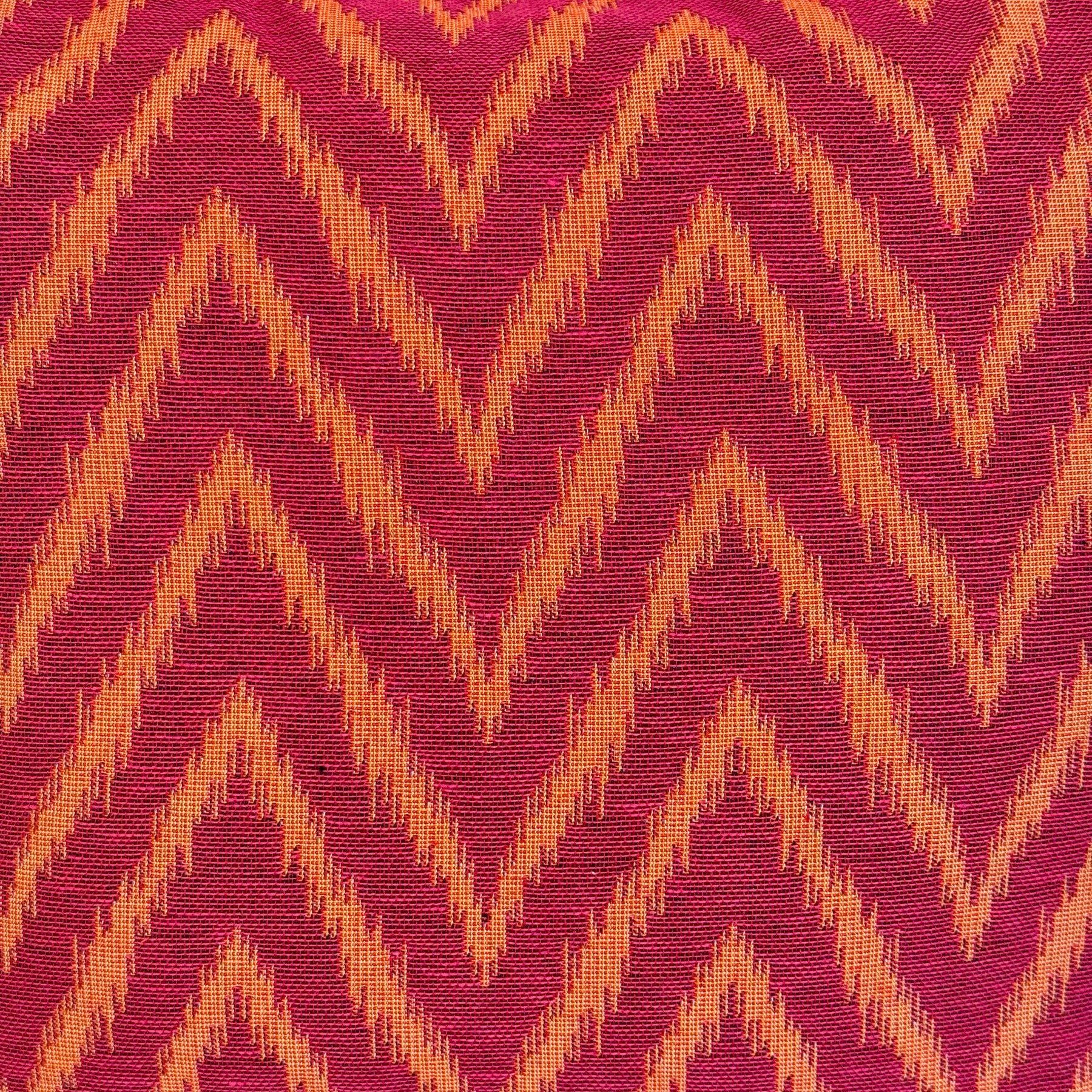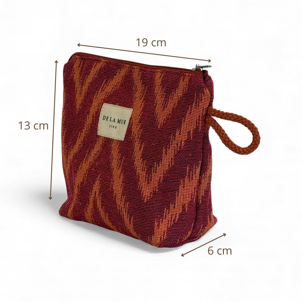 Neceser pequeño con cremallera en la parte superior y con asa lateral de cordón de color teja. Con tejido grueso de jacquard 80% algodón y 20% poliéster con estampado tipo zigzag en tonos rosa fucsia y naranja. Cada articulo puede tener una variación en el estampado, dependiendo de donde se haya efectuado el corte de la pieza. Para su correcto mantenimiento se aconseja lavarlo en frío y no utilizar secadora.