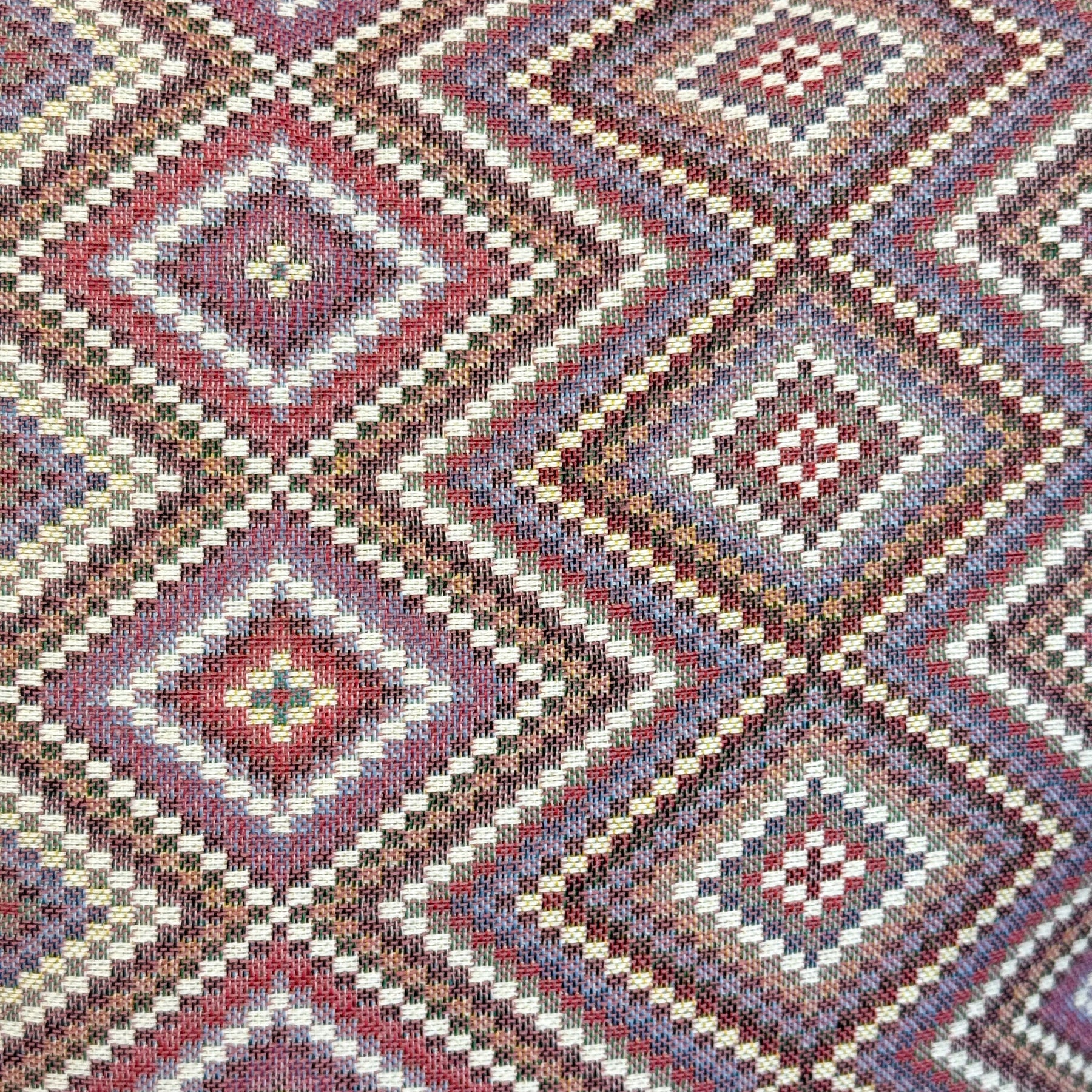 Neceser pequeño con cremallera en la parte superior y con asa lateral de cordón de color beige. Con tejido grueso de jacquard 80% algodón y 20% poliéster con estampado geométrico en tonos rosa y lila. Cada articulo puede tener una variación en el estampado, dependiendo de donde se haya efectuado el corte de la pieza. Para su correcto mantenimiento se aconseja lavarlo en frío y no utilizar secadora.