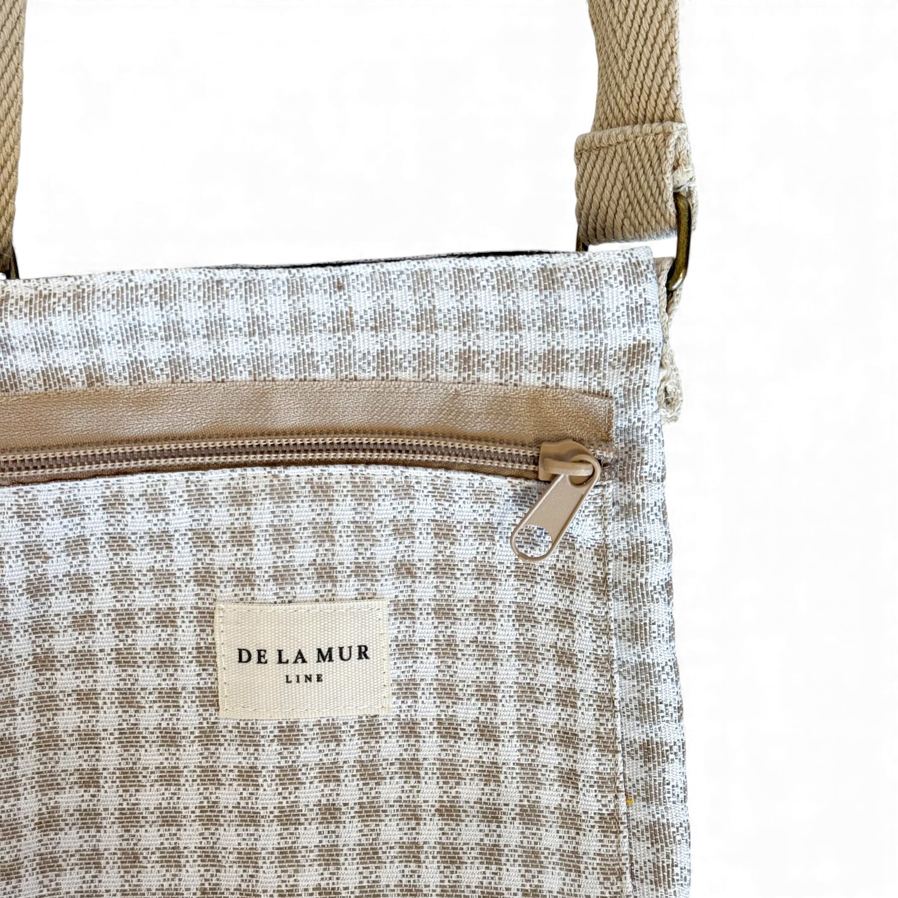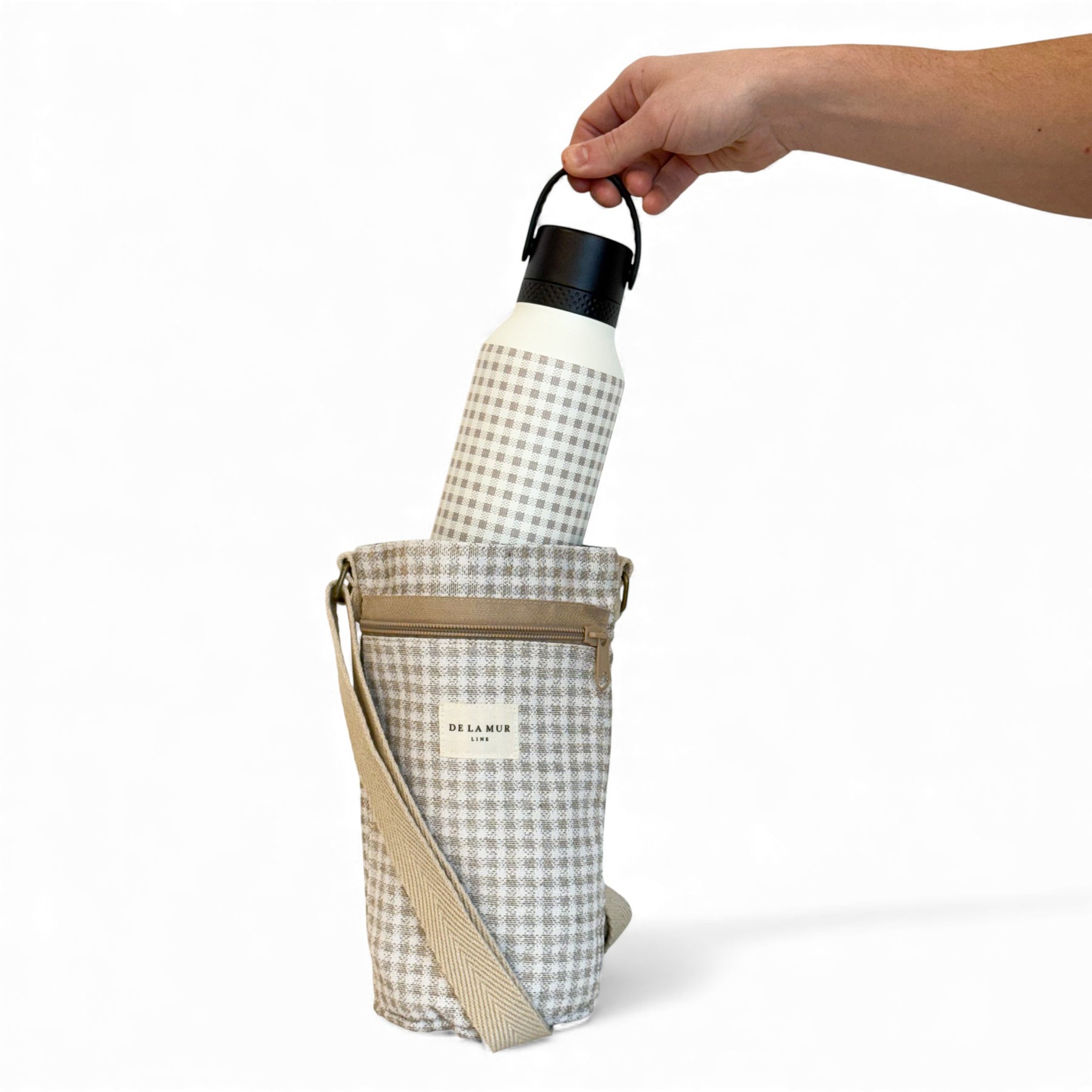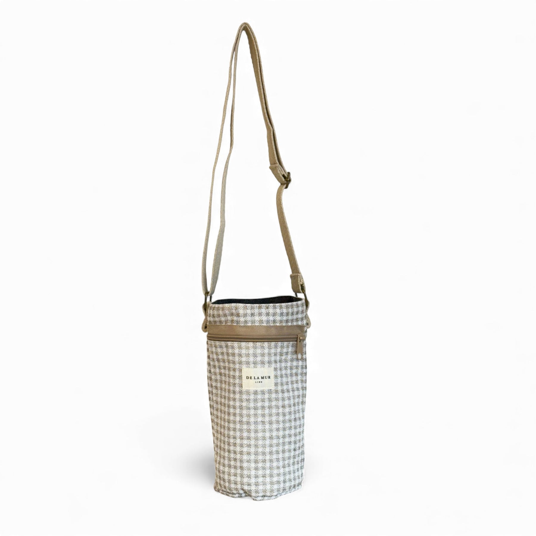 Bolso porta botellas. Con un tejido grueso de jacquard 80% algodón y 20% poliéster con estampado a cuadros vichy en tonos beige y crudo. Forrado de tejido grueso de color gris en la parte interior. Con asa de cinta de algodón de color beige regulable para llevar cruzado. Con bolsillo exterior con cremallera. Caben botellas de hasta 1,5L.
