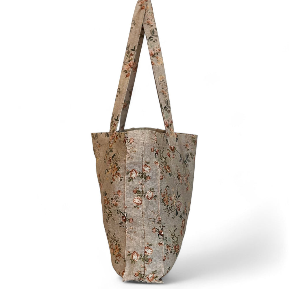 Bolsa rectangular con asas para llevar al hombro. Con un tejido fino con estampado floral en tonos caldera. Para su correcto mantenimiento se aconseja lavarlo en frío a mano y no utilizar secadora.