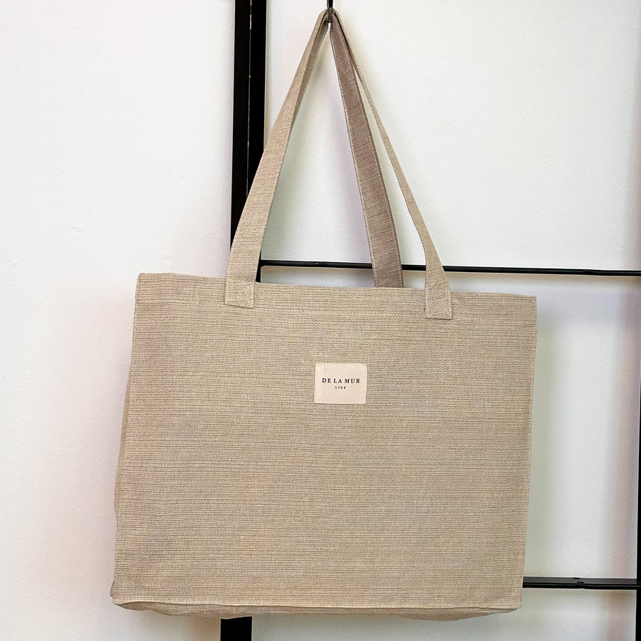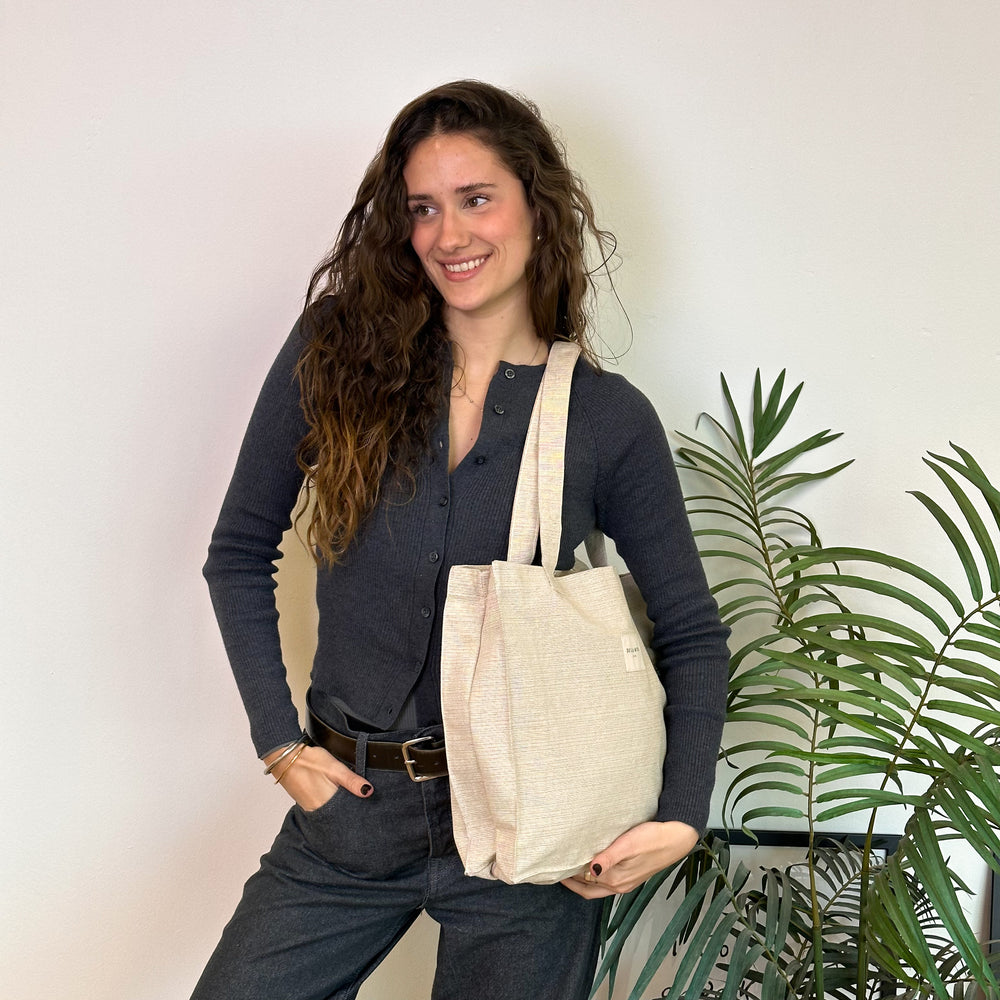 Bolsa rectangular con asas para llevar al hombro. Con un tejido liso beige. Para su correcto mantenimiento se aconseja lavarlo en frío a mano y no utilizar secadora.
