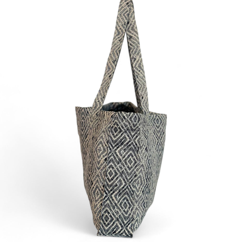 Bolsa rectangular con asas para llevar al hombro. Con un tejido grueso de jacquard con estampado geométrico en tonos gris oscuro. Para su correcto mantenimiento se aconseja lavarlo en frío a mano y no utilizar secadora.