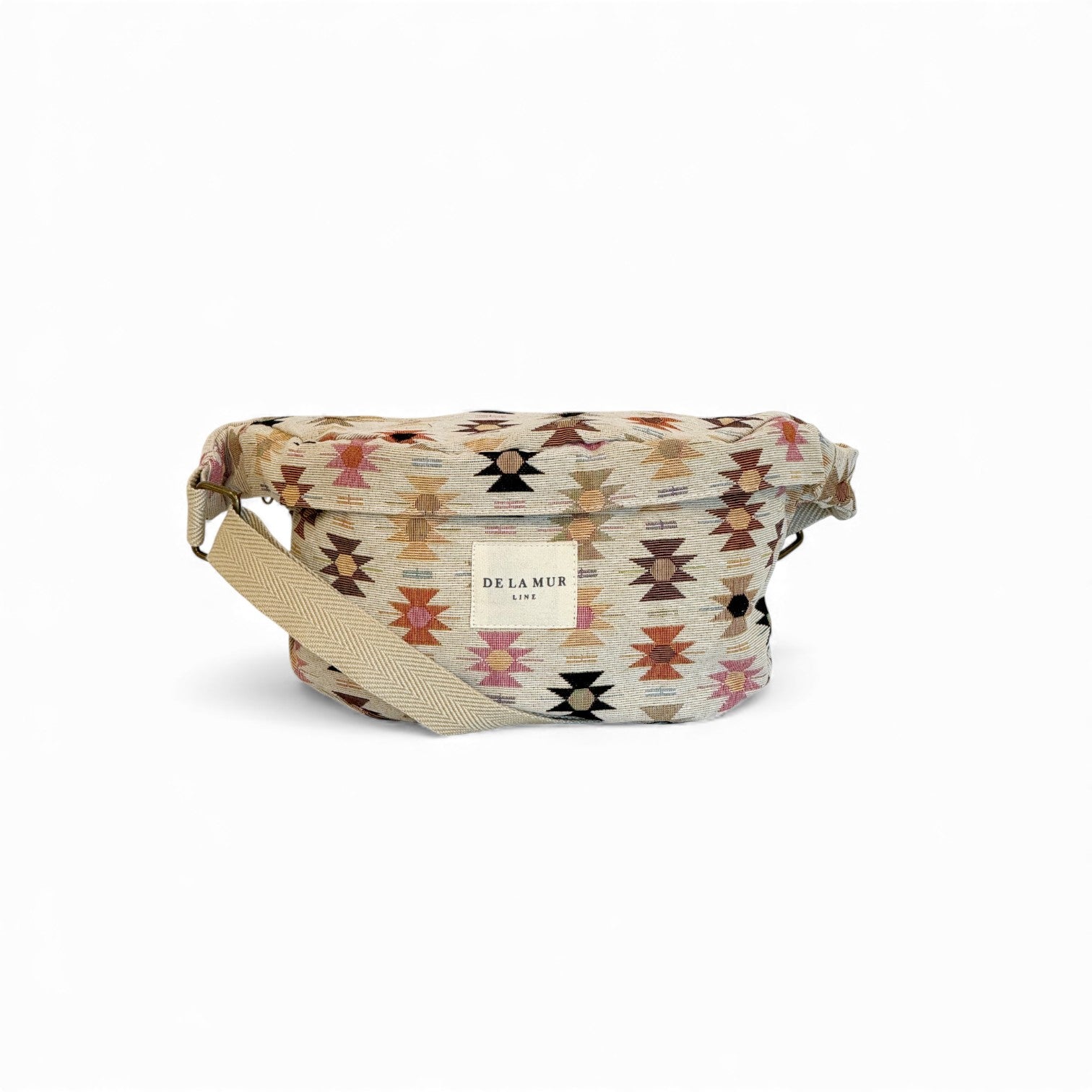 Bolso riñonera tipo bandolera con asa larga ajustable de cinta de espiga de algodón de color beige. Con un tejido grueso de jacquard 80% algodón y 20% poliéster con estampado geométrico en tonos rosados y naranjas sobre fonbdo beige. Cierre superior con cremallera. Con bolsillo interior. Forrado de tejido grueso de color gris en la parte interior. Para su correcto mantenimiento se aconseja lavarlo en frío a mano y no utilizar secadora.