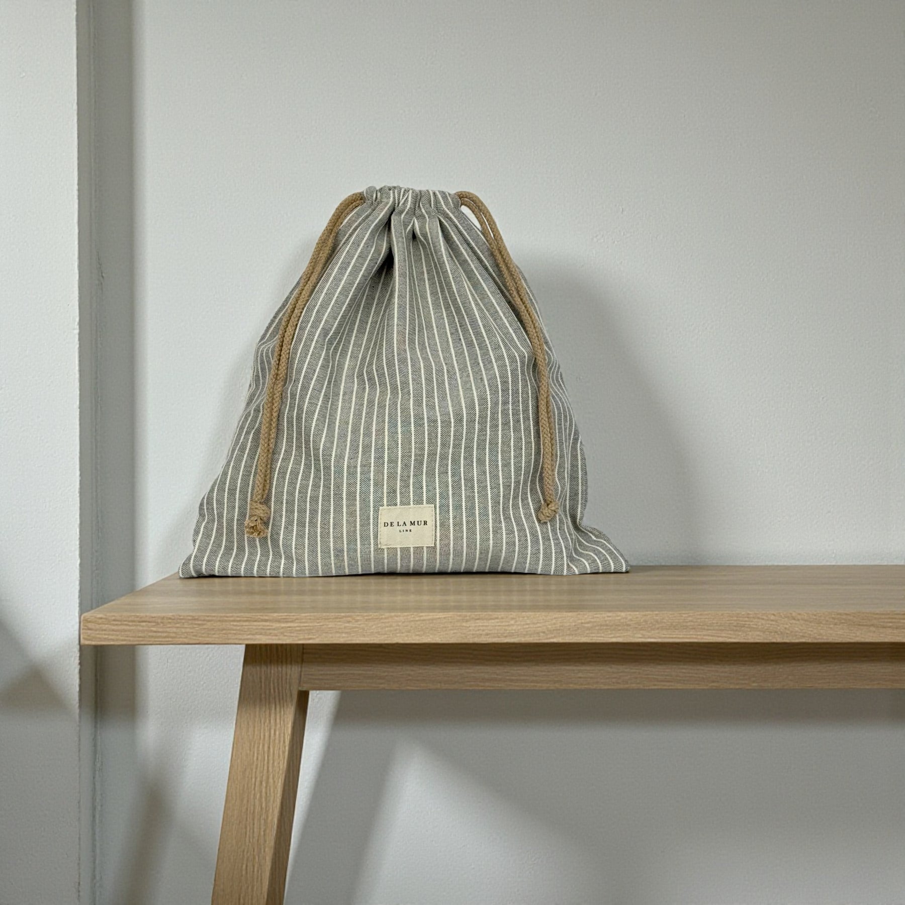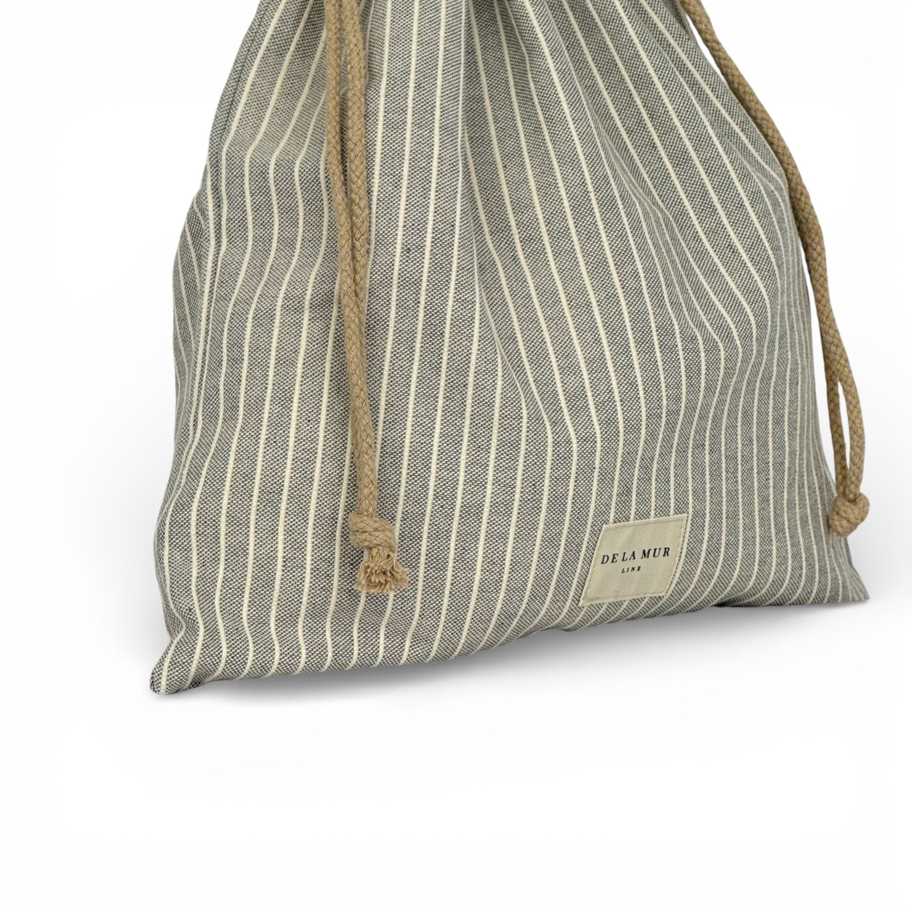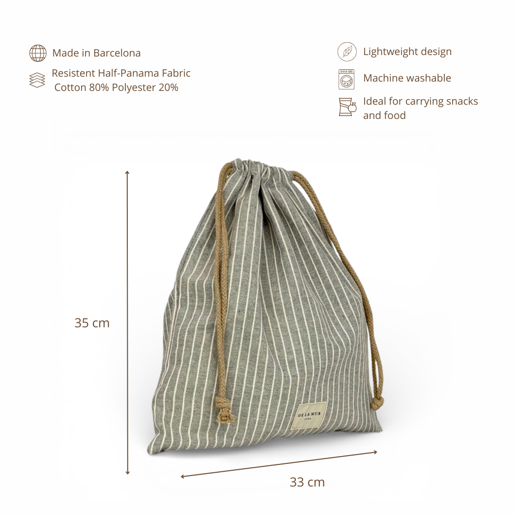 Bolsa tipo merienda confeccionada en tejido fino con relieve 80% algodón y 20% poliéster, con estampado a rayas gris. Resistente, práctica y con un diseño especial que la hace perfecta para el día a día.