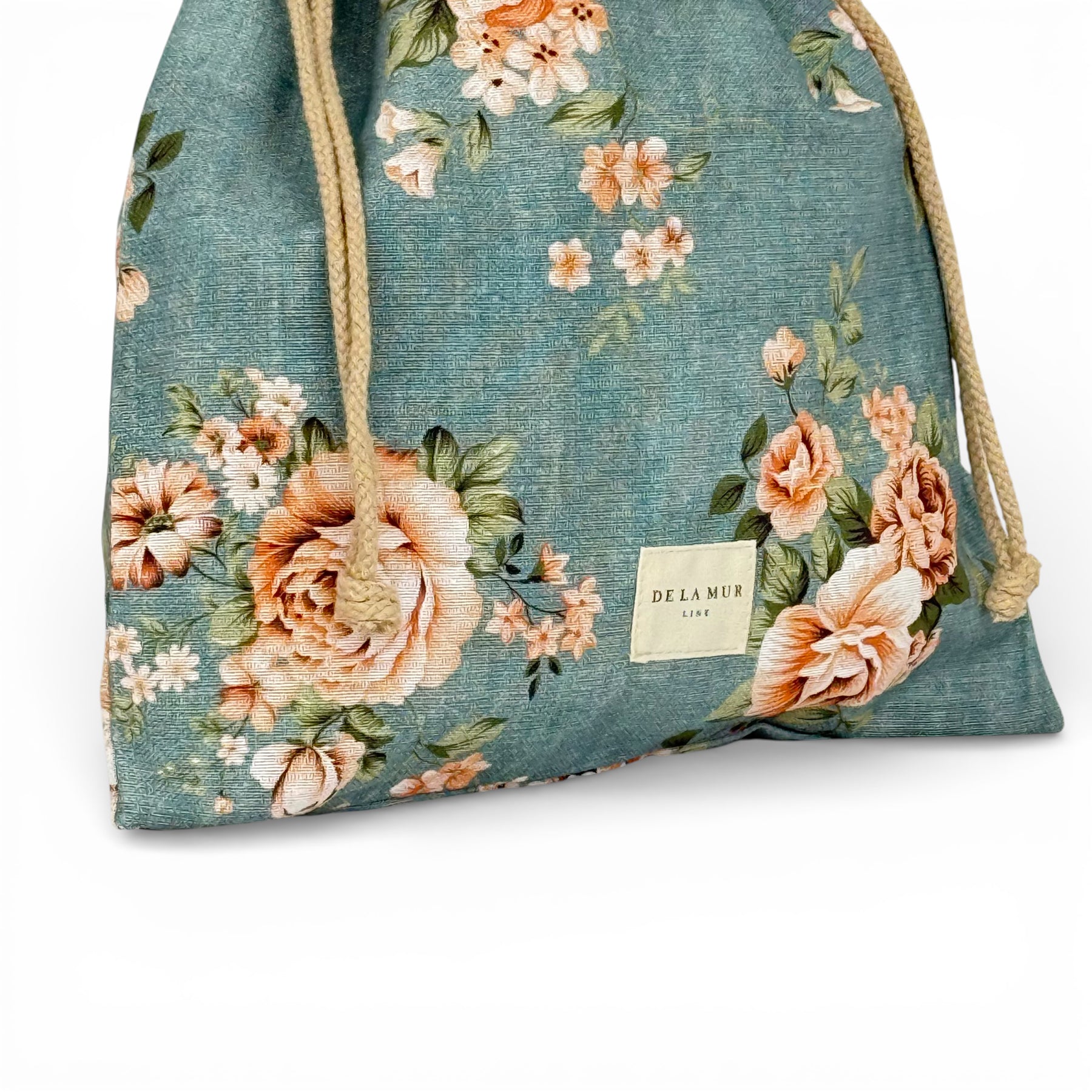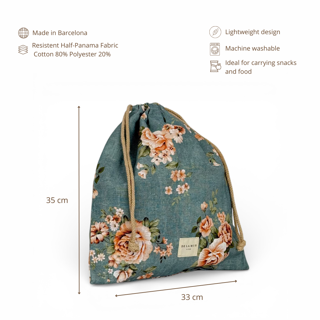 Bolsa tipo merienda confeccionada en tejido fino de half-panama 80% algodón y 20% poliéster, con estampado floral rosado sobre fondo azul. Resistente, práctica y con un diseño especial que la hace perfecta para el día a día.