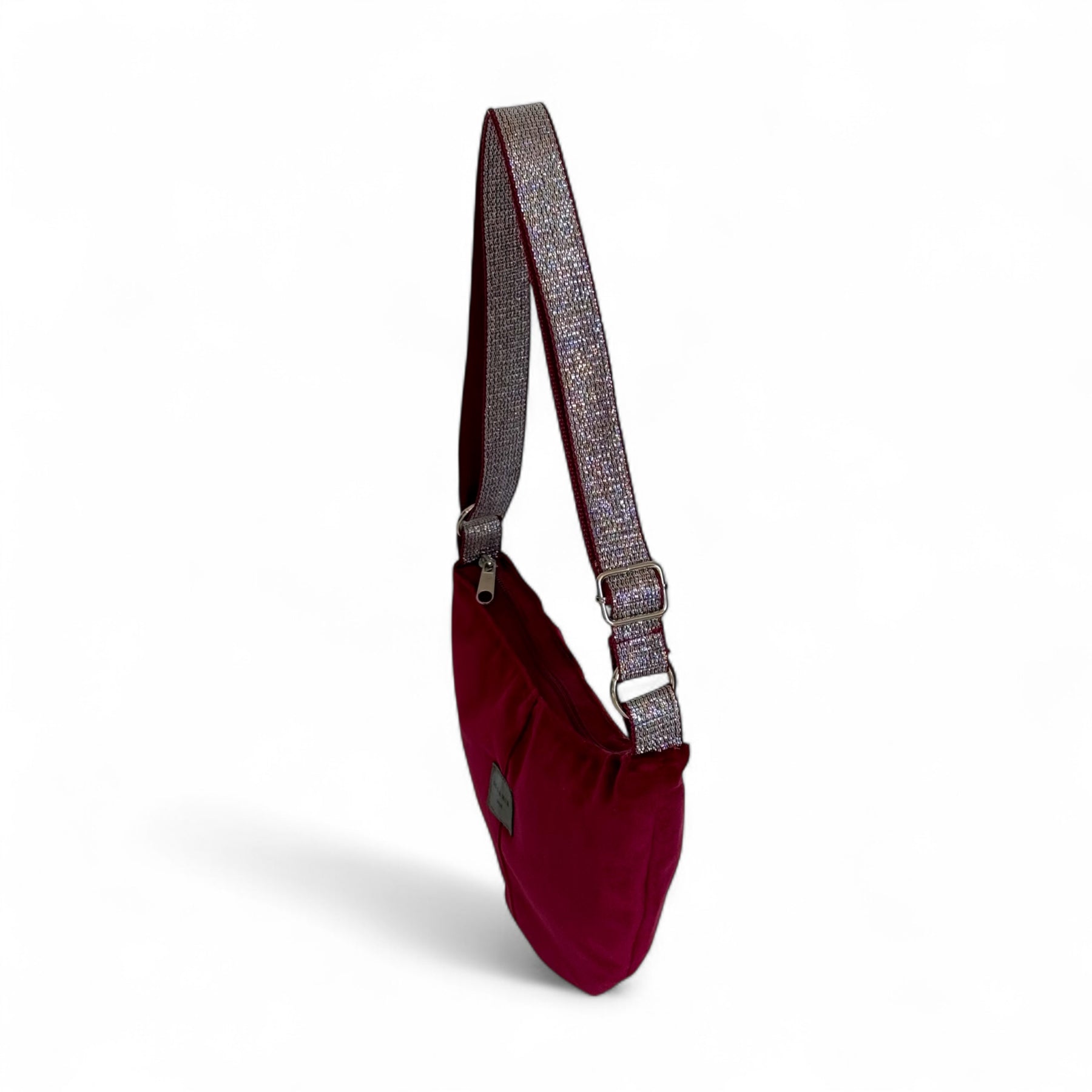 Bolso pequeño edición fiesta con asa larga ajustable. Con un tejido de terciopelo de color burdeos. Opción de llevarlo al hombro o como bandolera. Bolsillo interior con cremallera. Asa de cinta de algodón de color burdeos con lurex plateado en una cara. Etiqueta de marca de polipiel plateada. Para su correcto mantenimiento se aconseja lavarlo en frío a mano y no utilizar secadora.