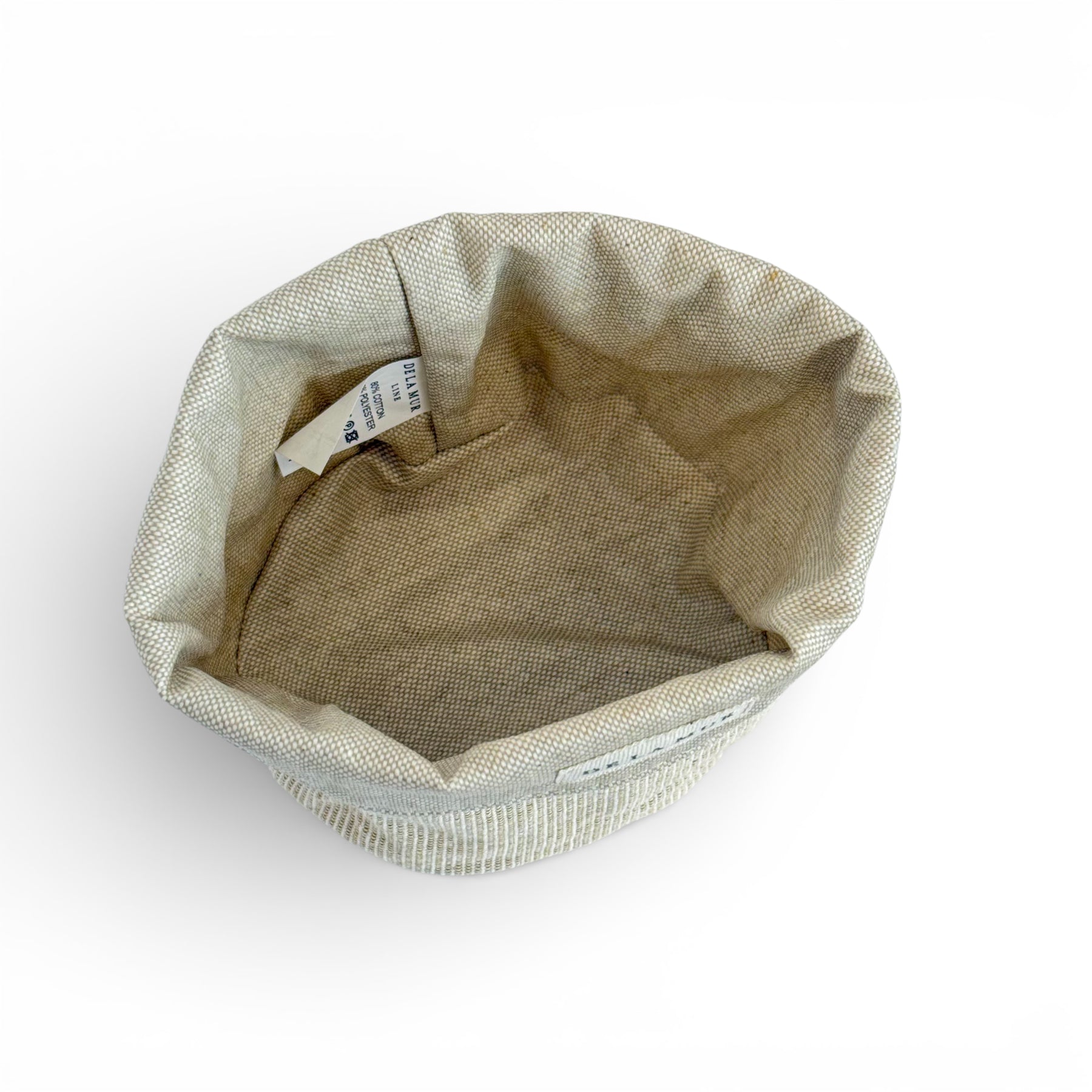 Cesta pequeña multiusos confeccionada en tejido fino con relieve 80% algodón y 20% poliéster, con estampado a mini rayas mostaza en el exterior. El interior está realizado en tejido beige resinado, ideal para aportar mayor resistencia y practicidad en el uso diario.