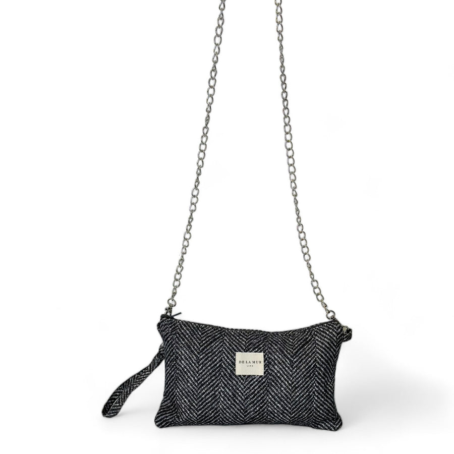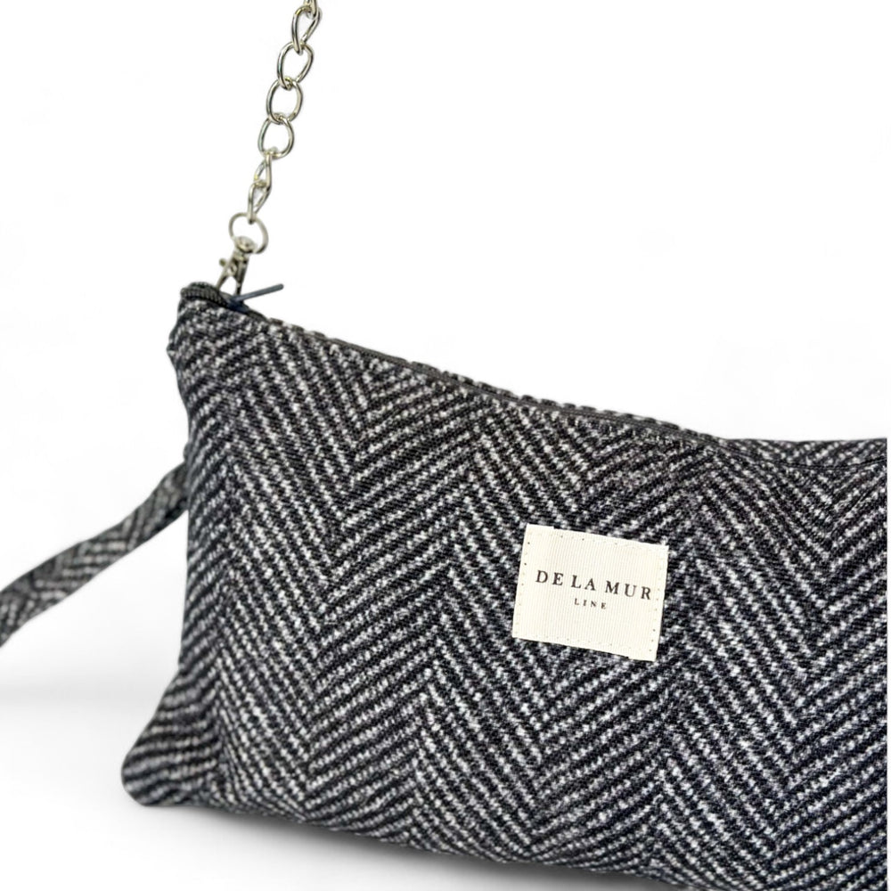 Bolso tipo “Clutch” con asa de cadena de color plata y con asa pequeña en el lateral extraíble para llevar en la muñeca. Con tejido fino con estampado de espiga de color gris muy oscuro. Con forro interior y cremallera en la parte superior. Para su correcto mantenimiento se aconseja lavarlo en frío y no utilizar secadora.