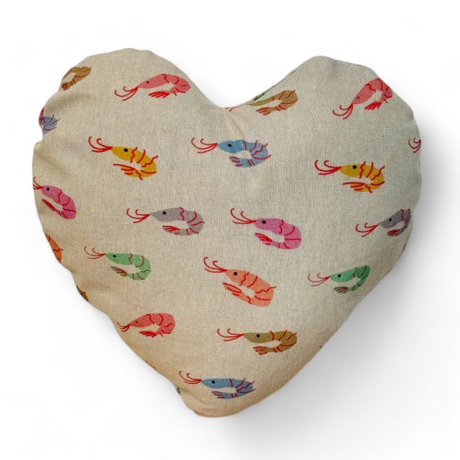 Cojín en forma de corazón con relleno. Con tejido fino de half-panama con estampado de gambas multicolor sobre fondo beige. Para su correcto mantenimiento se aconseja lavarlo en frío y no utilizar secadora.