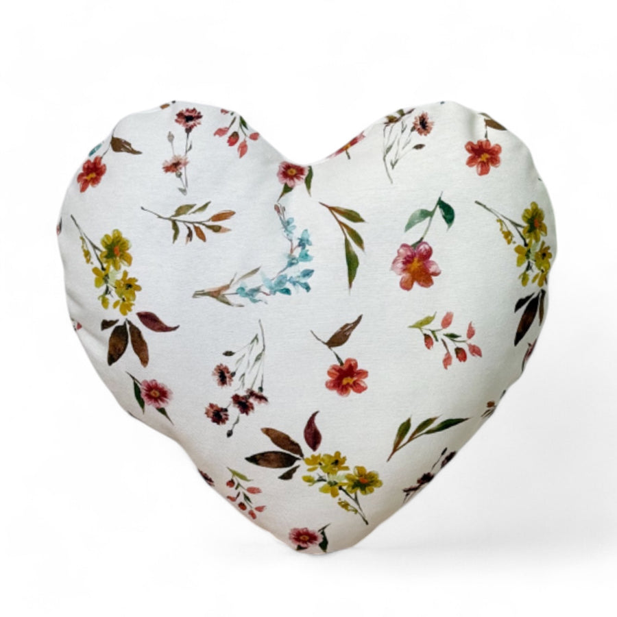 Cojín en forma de corazón con relleno. Con tejido fino de half-panama con estampado floral sobre fondo crudo. Para su correcto mantenimiento se aconseja lavarlo en frío y no utilizar secadora.