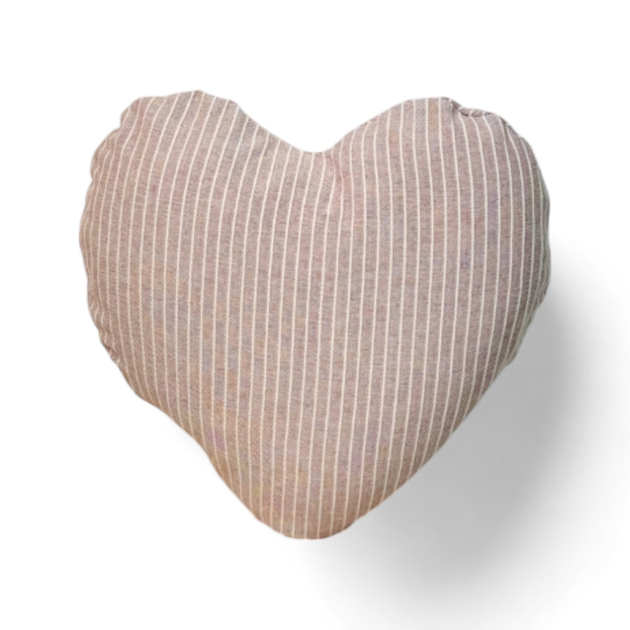 Cojín en forma de corazón con relleno. Con tejido fino con textura y con estampado a rayas de color crudo sobre fondo rosa palo. Para su correcto mantenimiento se aconseja lavarlo en frío y no utilizar secadora.