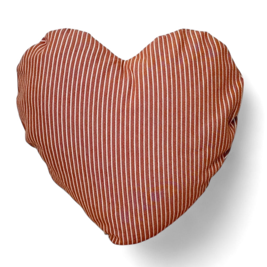 Cojín en forma de corazón con relleno. Con tejido fino con textura con estampado a rayas de color crudo sobre fondo caldera. Para su correcto mantenimiento se aconseja lavarlo en frío y no utilizar secadora.