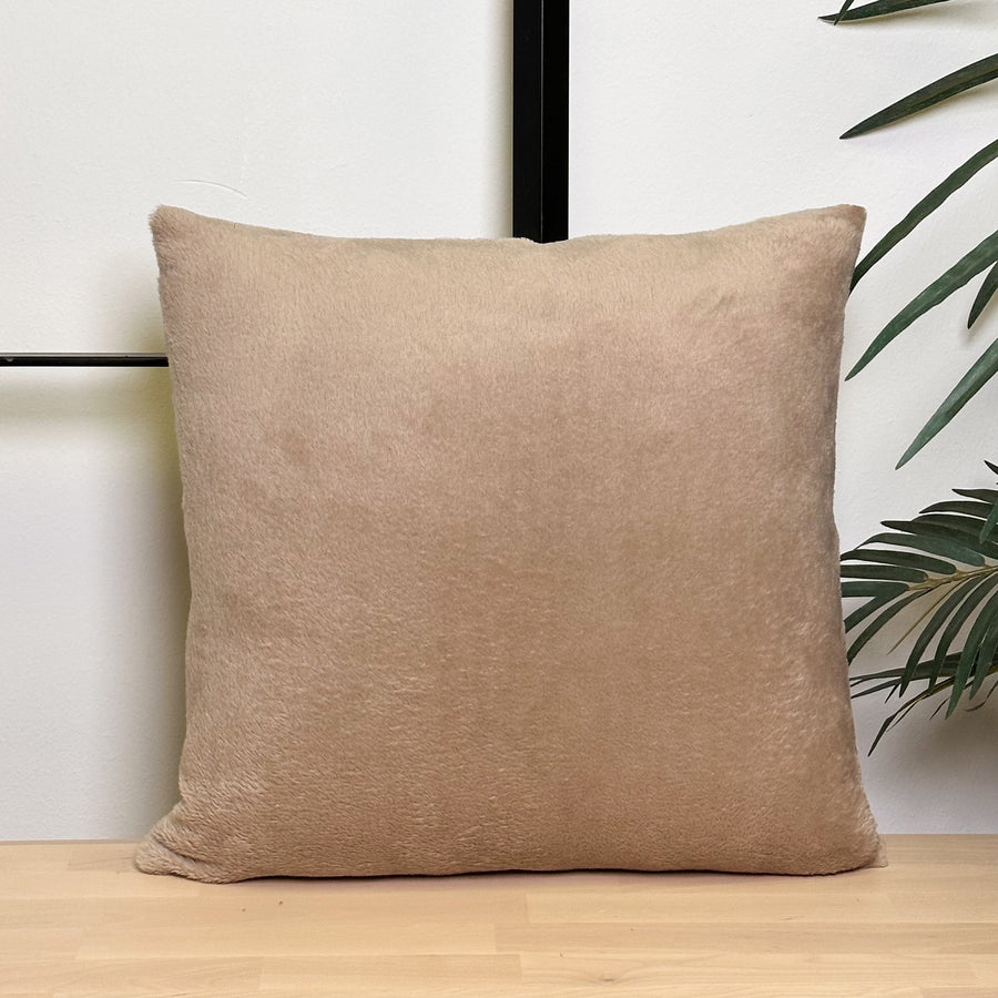 Funda de cojín sin relleno. Combinado con dos tejidos diferentes, un tejido de pelo suave de color beige por una cara, y un tejido liso de color yute por la otra. Para su correcto mantenimiento se aconseja lavarlo en frío y no utilizar secadora.