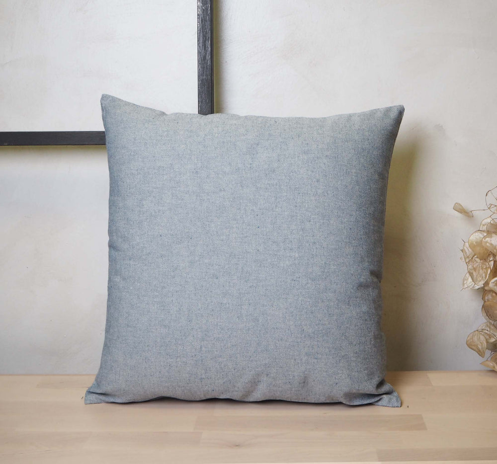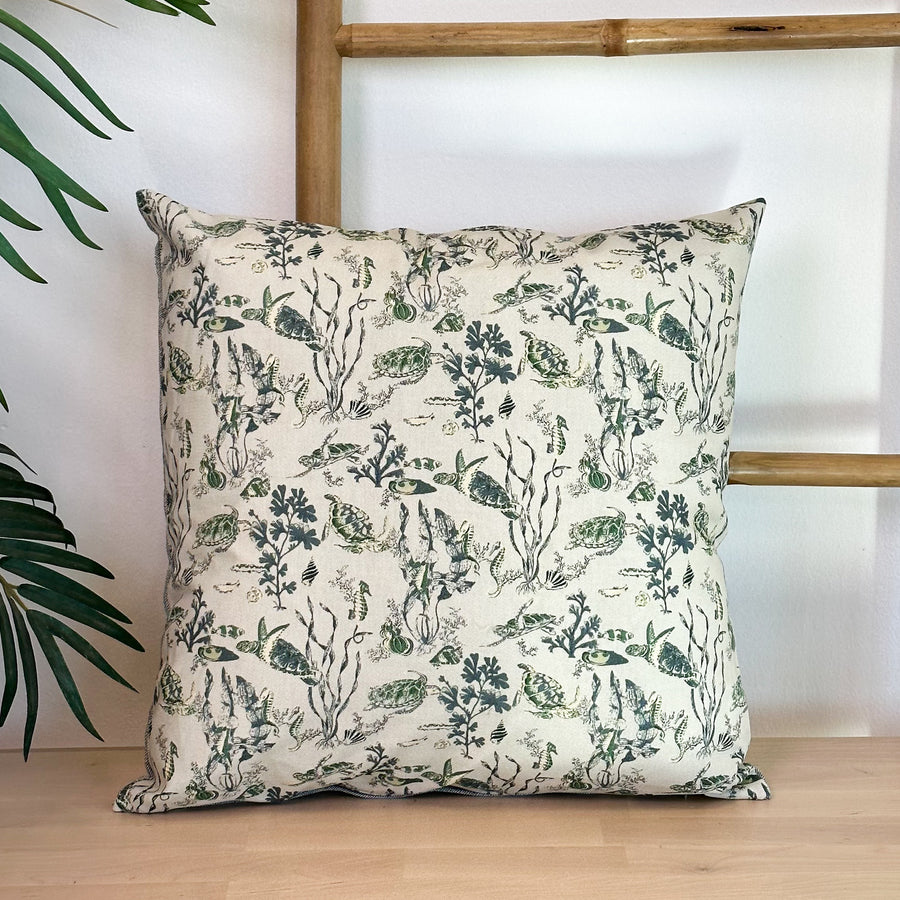 Funda de cojín sin relleno. Combinado con dos tejidos diferentes, un tejido con estampado de tortugas en tonos verdes y azules por una cara, y un tejido liso de color azul por la otra. Para su correcto mantenimiento se aconseja lavarlo en frío y no utilizar secadora.