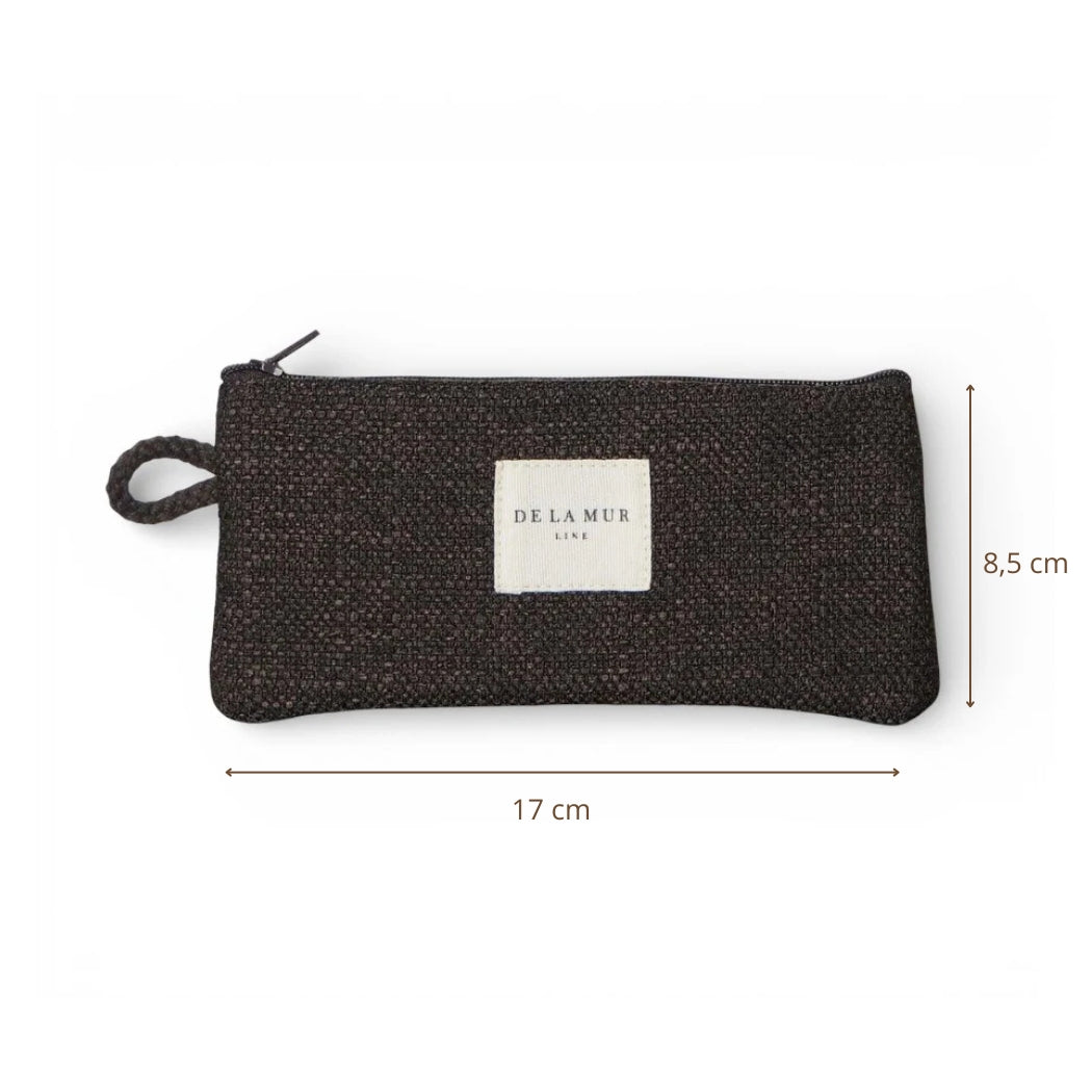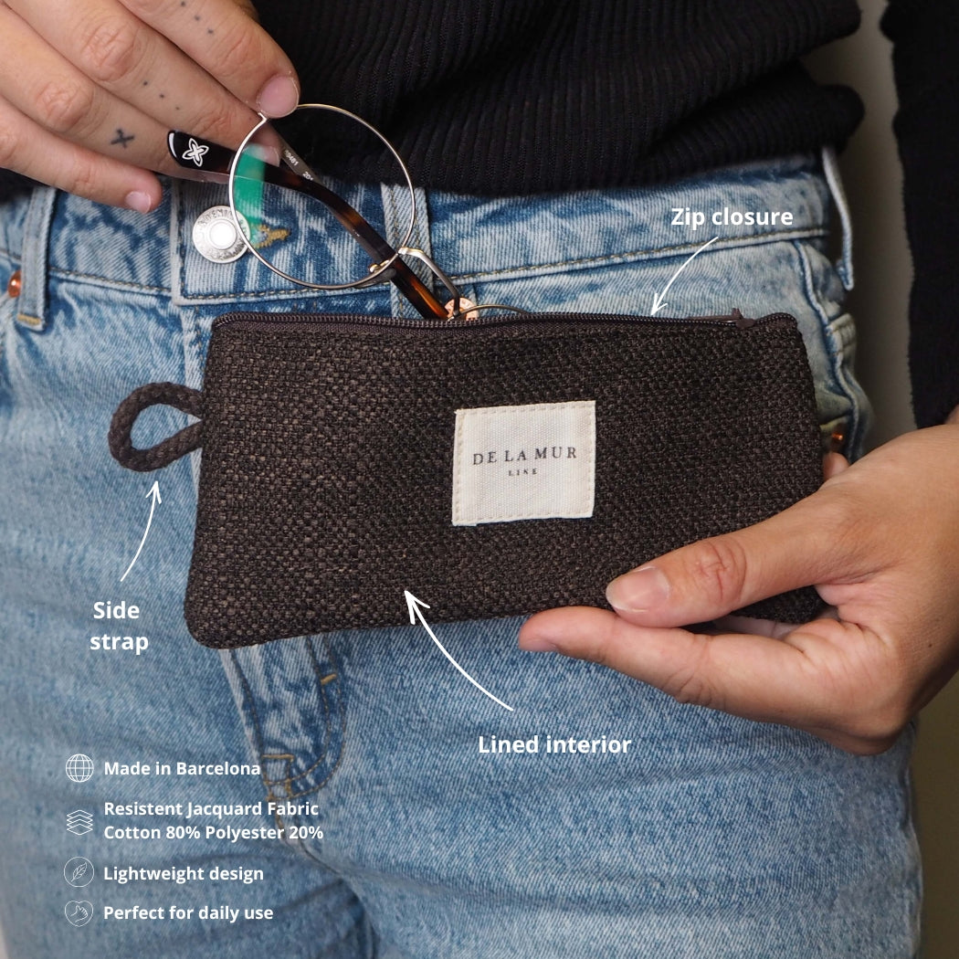 Funda de gafas con cremallera en la parte superior y pequeña asa de cordón de color marrón en el lateral. Con tejido grueso de color marrón. Cada articulo puede tener una variación en el estampado, dependiendo de donde se haya efectuado el corte de la pieza. Forrado de tejido grueso de color gris en la parte interior. Para su correcto mantenimiento se aconseja lavarlo en frío a mano y no utilizar secadora.