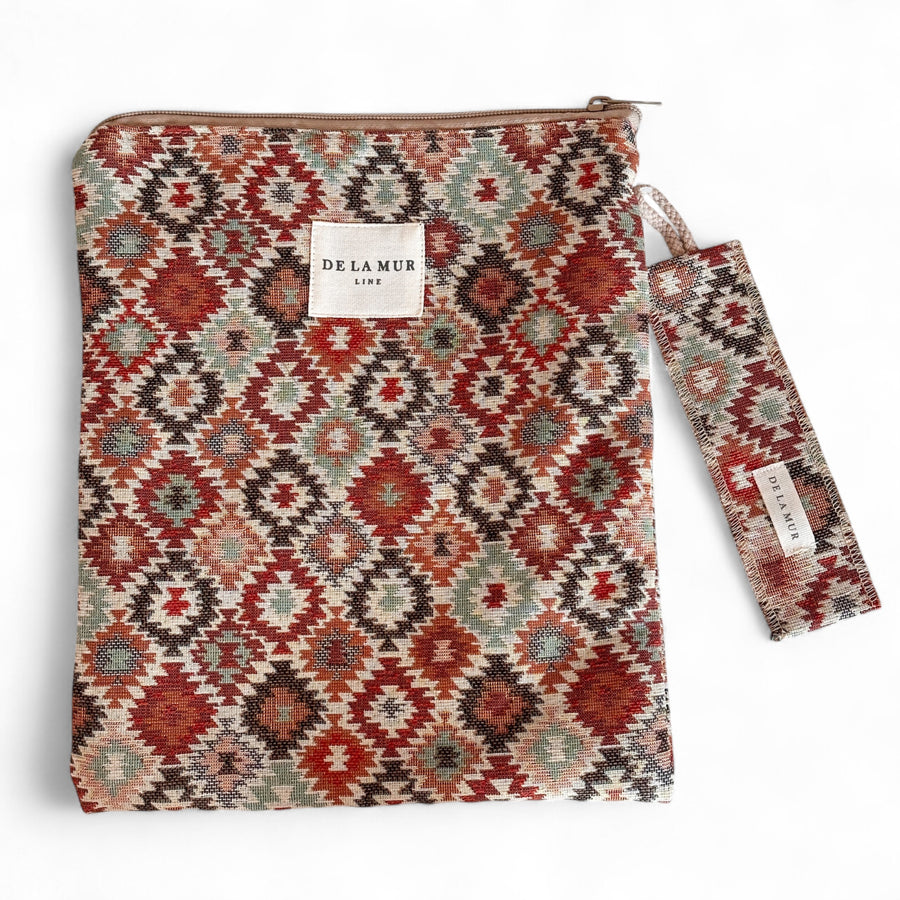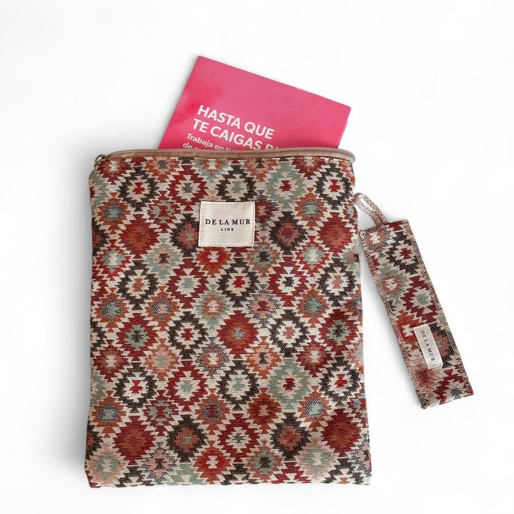 Funda de libro con cremallera con punto de libro a conjunto. Con un tejido grueso de jacquard con estampado geométrico multicolor. Forrado de tejido grueso de color gris en la parte interior. Para su correcto mantenimiento se aconseja lavarlo en frío a mano y no utilizar secadora.