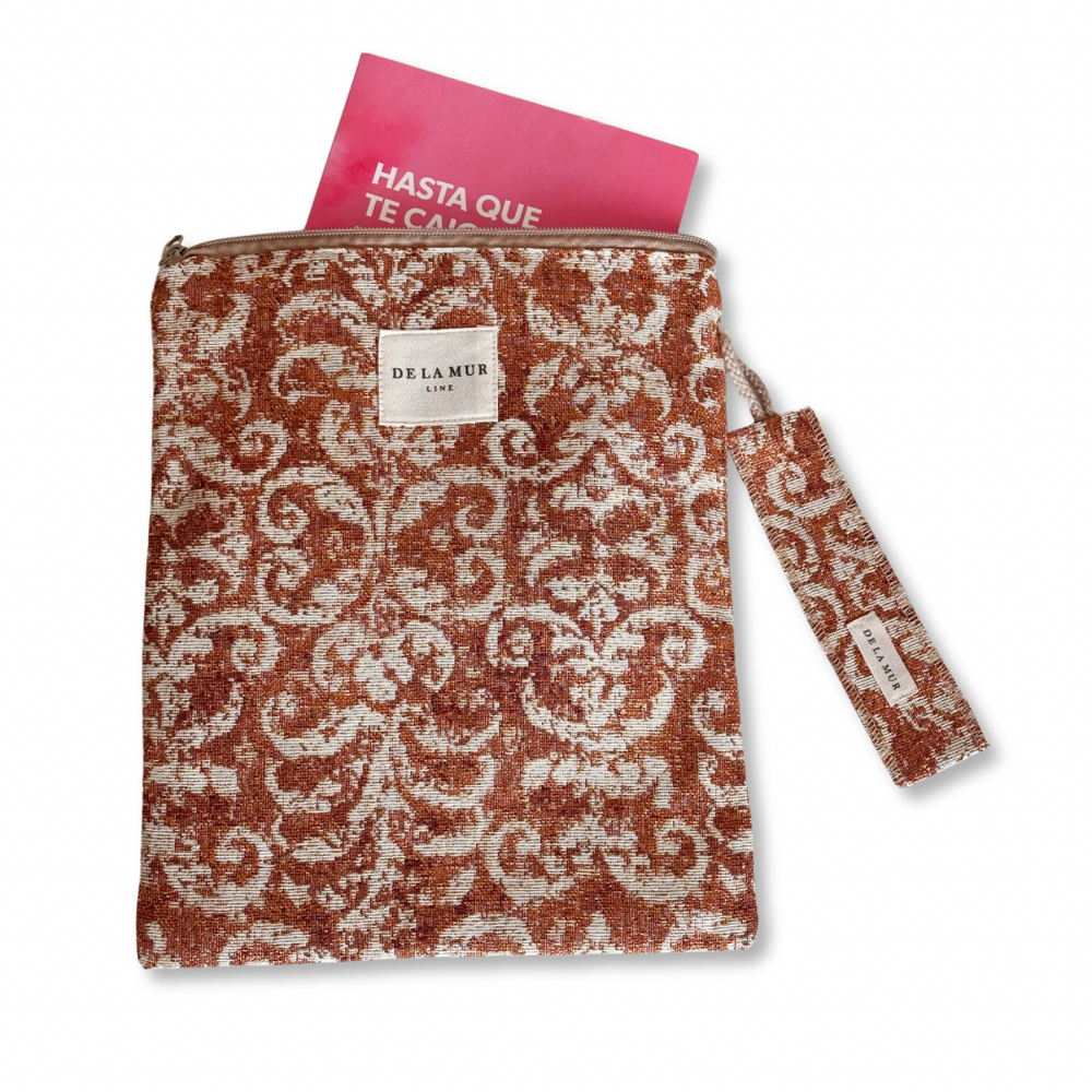 Funda de libro con cremallera con punto de libro a conjunto. Con un tejido grueso de jacquard con estampado geométrico en tono crudo sobre fondo de color teja. Forrado de tejido grueso de color gris en la parte interior. Para su correcto mantenimiento se aconseja lavarlo en frío a mano y no utilizar secadora.