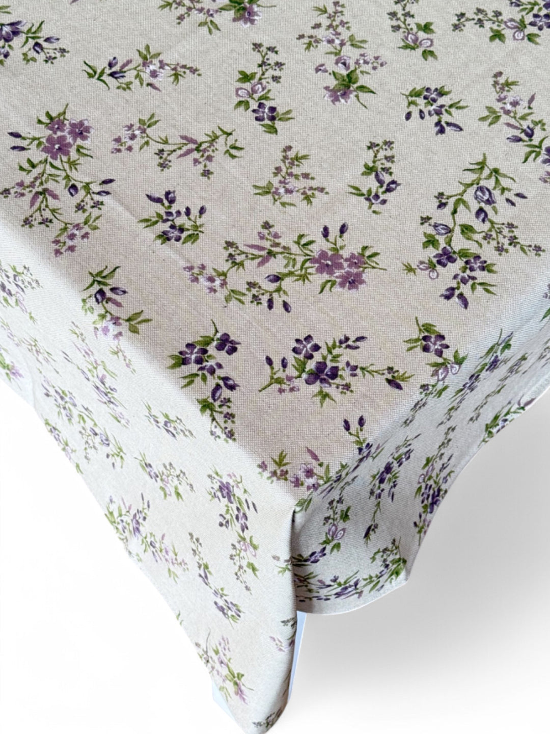 Mantel resinado para mesa. Con tejido resinado con estampado floral lila, resistente a manchas y fácil limpieza. Para su correcto mantenimiento se aconseja lavarlo en frío y no utilizar secadora.