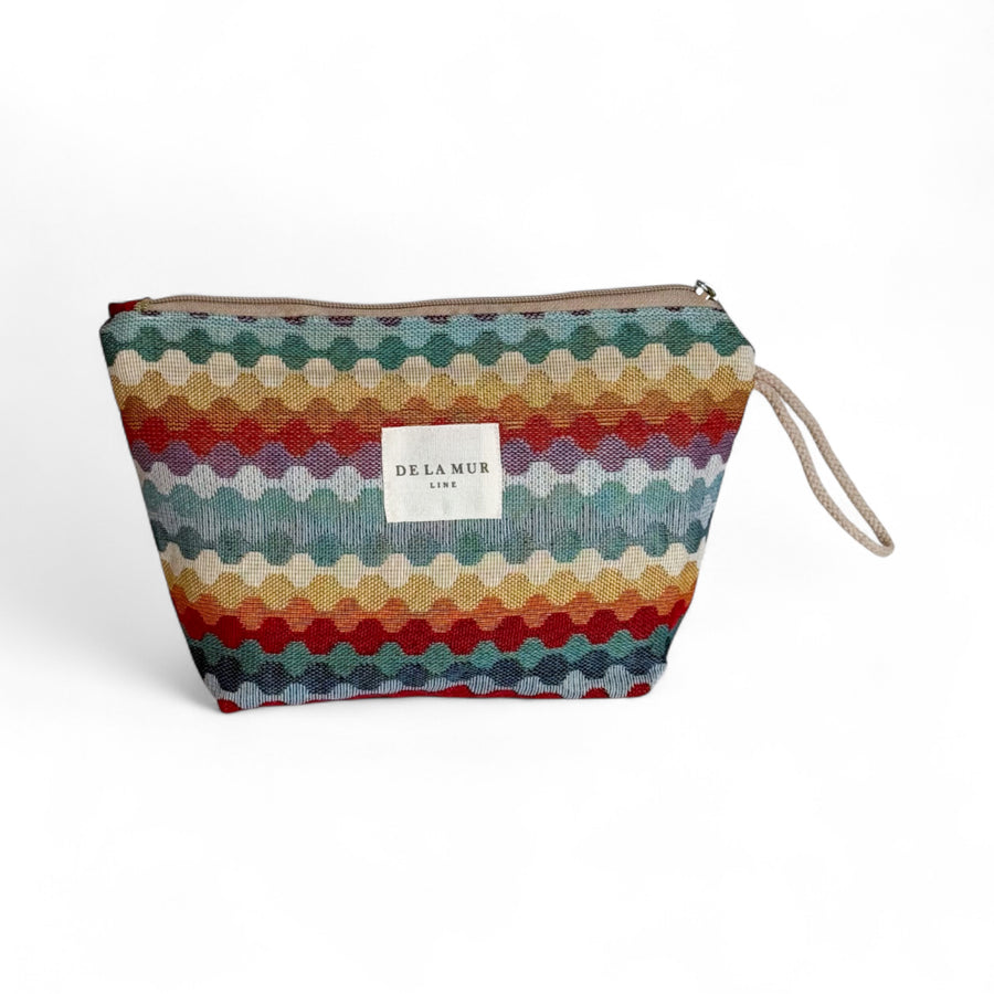 Neceser con cremallera en la parte superior y asa de cordón de color beige en el lateral. Con tejido grueso de jacquard con estampado geométrico multicolor. Forrado de tejido grueso de color gris en la parte interior. Para su correcto mantenimiento se aconseja lavarlo en frío a mano y no utilizar secadora.