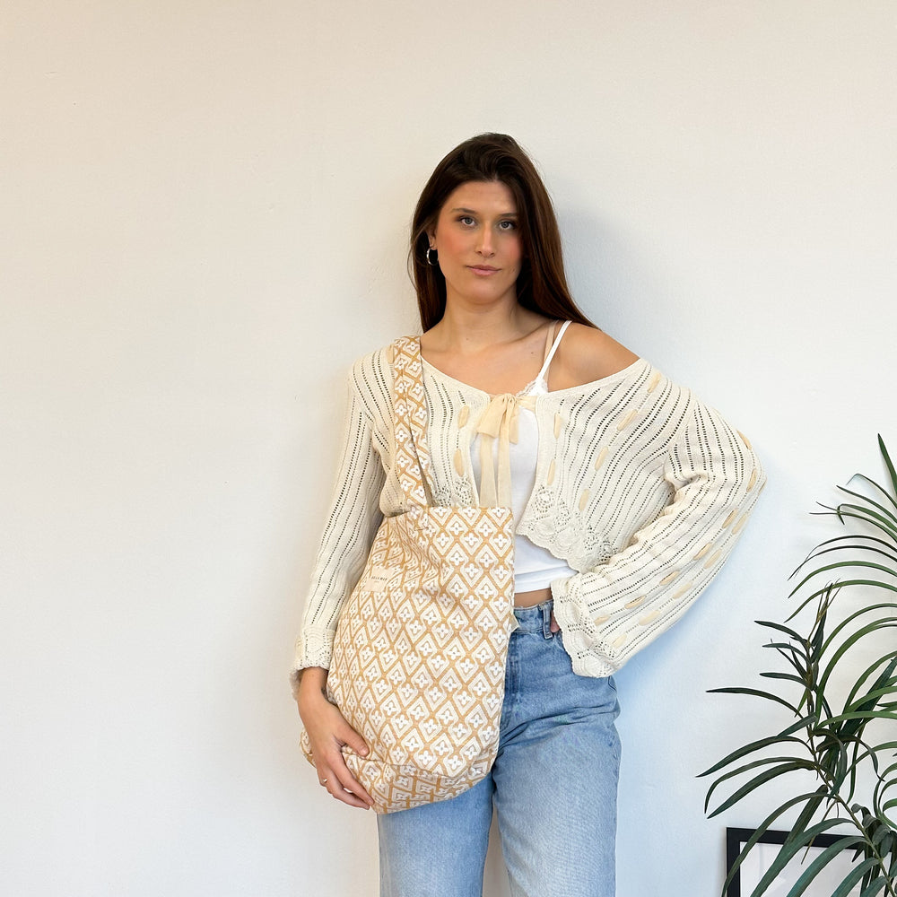 Bolsa shopper grande con asas para llevar al hombro. Con tejido con estampado geométrico de color mostaza. Para su correcto mantenimiento se aconseja lavarlo en frío a mano y no utilizar secadora.