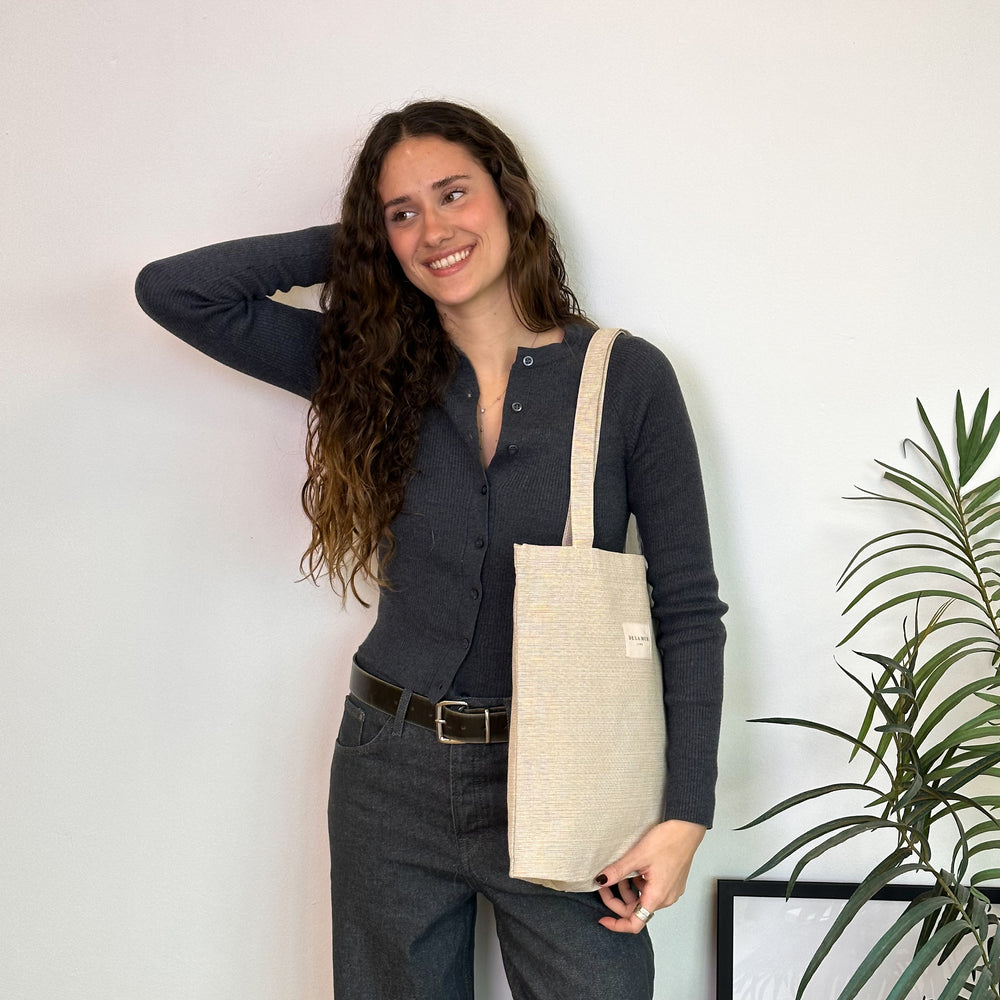 Bolsa “tote bag” con asas para llevar al hombro. Con un tejido liso beige. Para su correcto mantenimiento se aconseja lavarlo en frío y no utilizar secadora.