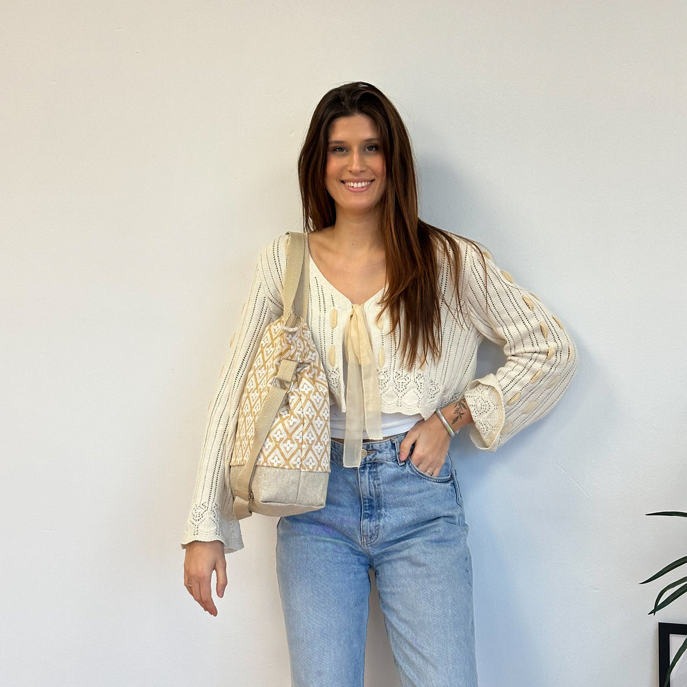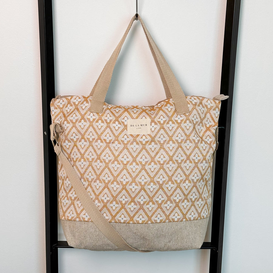 Bolso grande con asa larga ajustable y dos asas medianas en la parte superior de cinta de espiga de algodón de color beige. Combinado con dos tejidos diferentes, un tejido con estampado geométrico de color mostaza en la parte superior y un tejido grueso liso beige en la parte inferior. Cierre superior con cremallera. Forrado de tejido grueso de color gris en la parte interior. Bolsillo interior con cremallera. Opción de llevarlo al hombro o como bandolera. Para su correcto mantenimiento se aconseja lavarlo en frío a mano y no utilizar secadora.