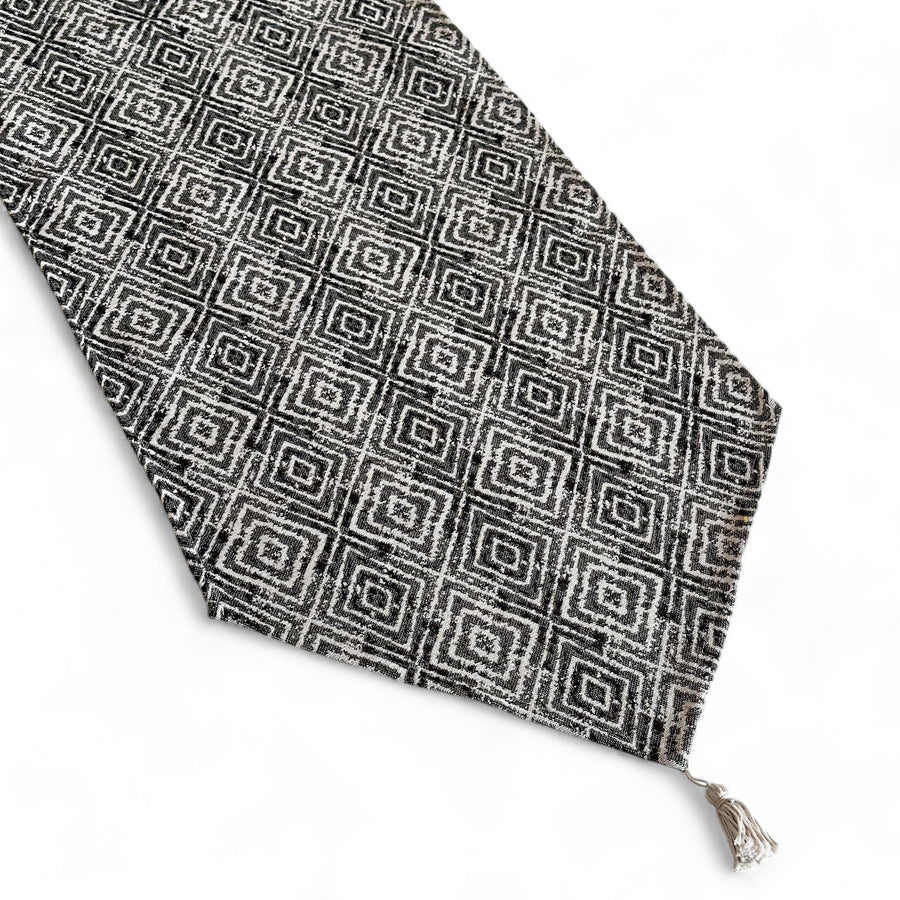 Camino de mesa acabado en forma de pico con borla en los extremos de color beige. Con tejido grueso de jacquard con estampado geométrico en tonos gris oscuro. Para su correcto mantenimiento se aconseja lavarlo en frío y no utilizar secadora.
