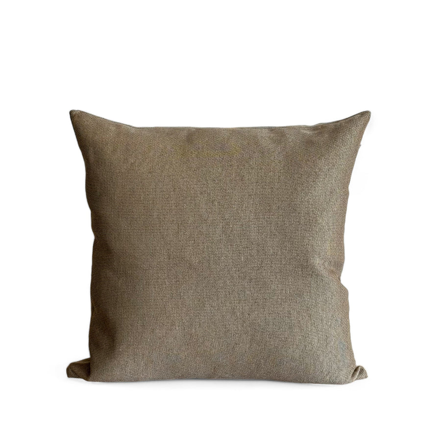 Funda de cojín sin relleno. Combinado con dos tejidos diferentes, un tejido grueso de jacquard liso de color beige oscuro por una cara, y un tejido liso de color beige por la otra. Para su correcto mantenimiento se aconseja lavarlo en frío y no utilizar secadora.
