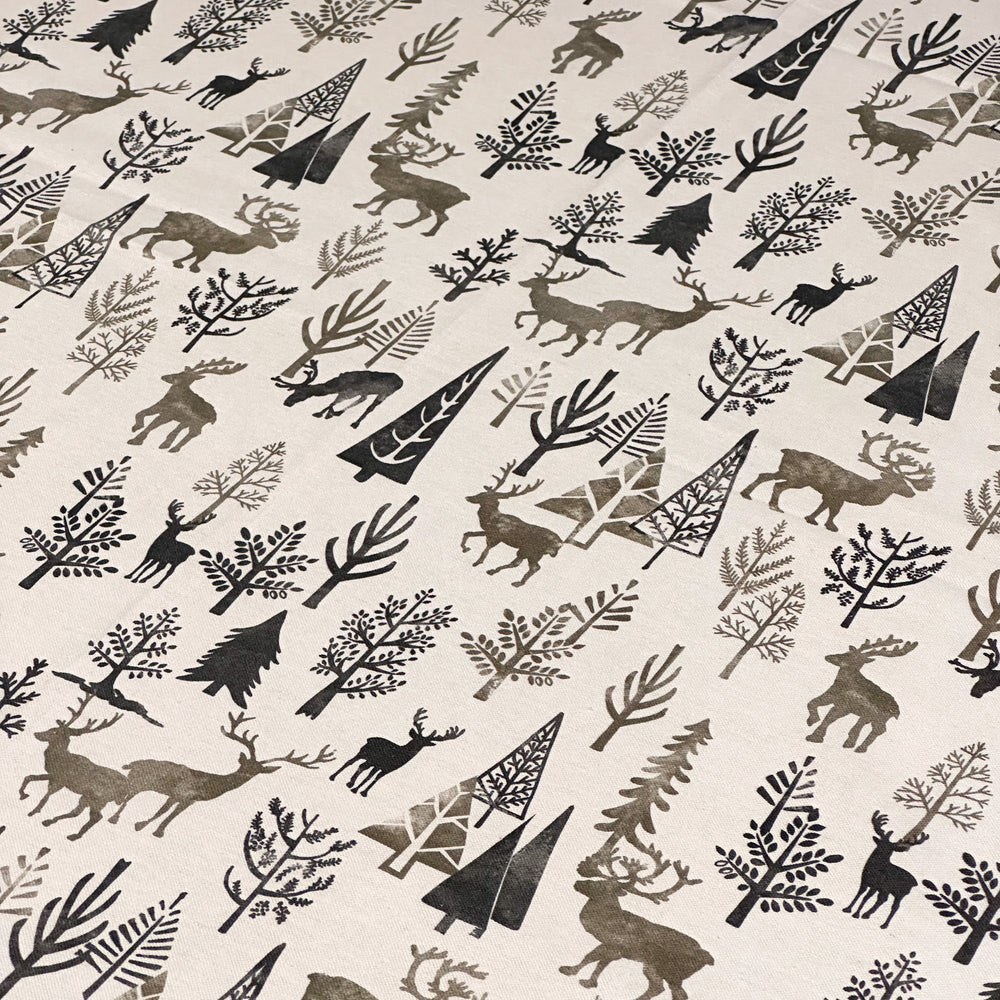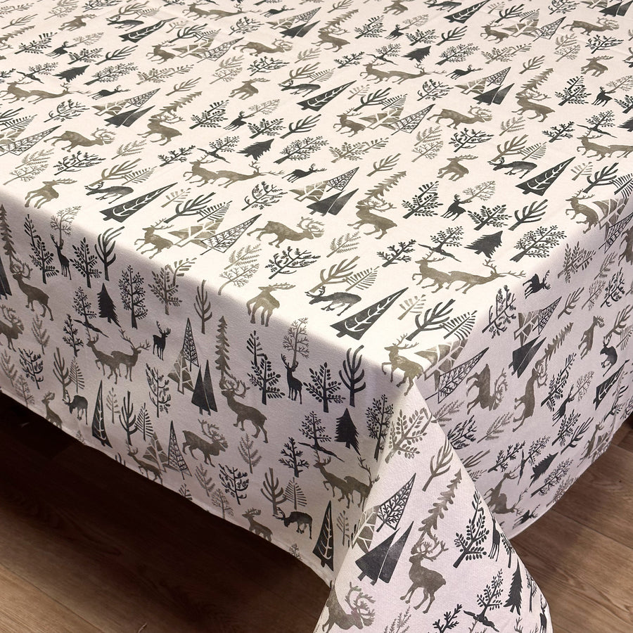 Mantel para mesa. Con tejido con estampado invernal en tonos marrón y gris sobre fondo blanco. Para su correcto mantenimiento se aconseja lavarlo en frío y no utilizar secadora.