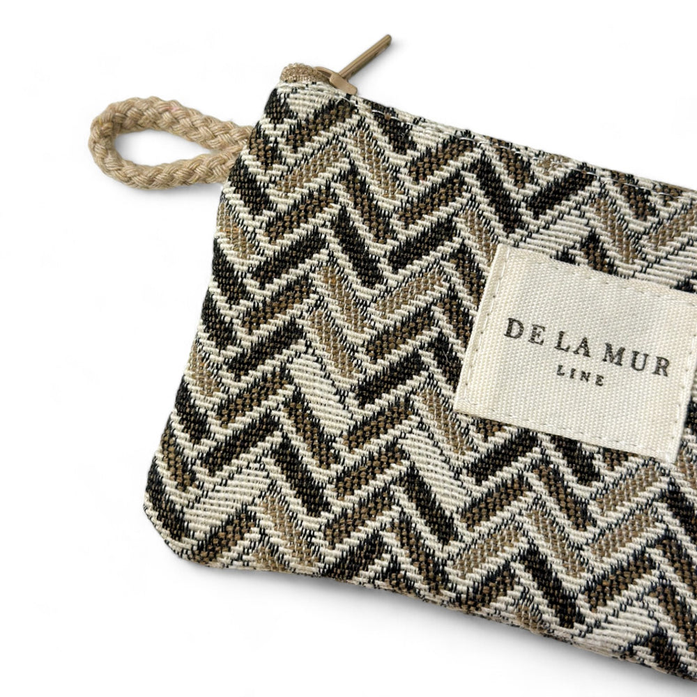 Monedero con cremallera en la parte superior y pequeña asa de cordón de color beige en el lateral. Con tejido grueso de jacquard con estampado geométrico en tonos beige y marrón. Cada articulo puede tener una variación en el estampado, dependiendo de donde se haya efectuado el corte de la pieza. Forrado de tejido grueso de color gris en la parte interior. Para su correcto mantenimiento se aconseja lavarlo en frío a mano y no utilizar secadora.