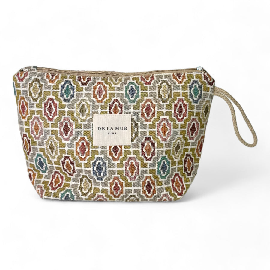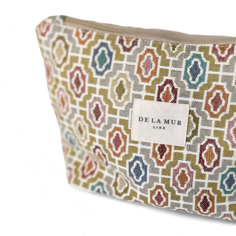 Neceser con cremallera en la parte superior y asa de cordón de color beige en el lateral. Con tejido grueso de jacquard con estampado geométrico en tonos beige, rosa y azul. Forrado de tejido grueso de color gris en la parte interior. Para su correcto mantenimiento se aconseja lavarlo en frío a mano y no utilizar secadora.