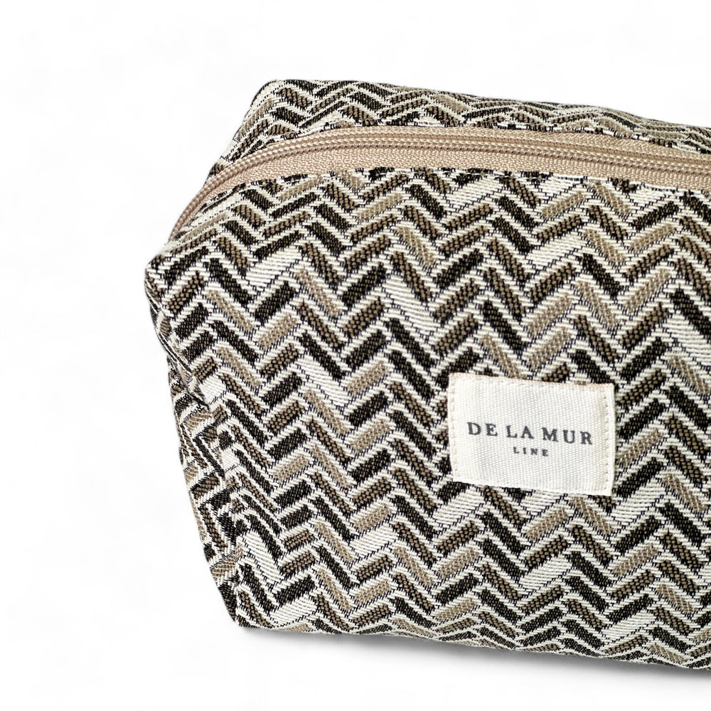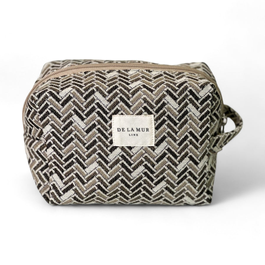Neceser mediano con cremallera en la parte superior y con asa lateral. Con tejido grueso de jacquard con estampado geométrico de color marrón. Para su correcto mantenimiento se aconseja lavarlo en frío y no utilizar secadora.