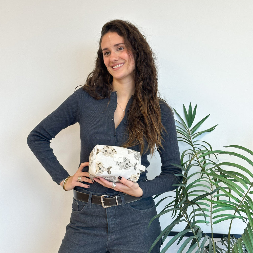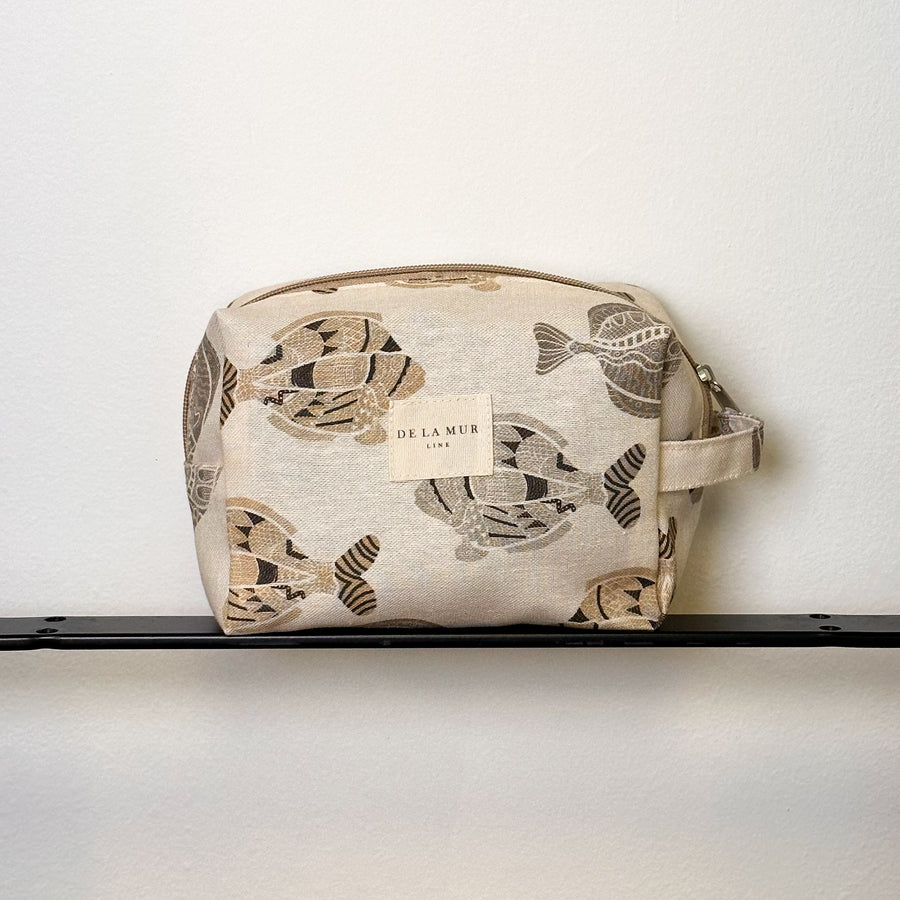 Neceser mediano con cremallera en la parte superior y con asa lateral. Con un tejido con estampado de peces en tonos marrones sobre fondo beige. Para su correcto mantenimiento se aconseja lavarlo en frío y no utilizar secadora.