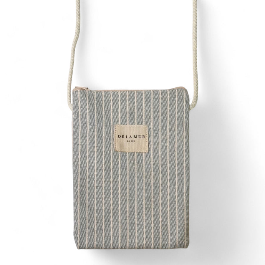 Bolsito porta móvil para llevar tipo bandolera. Con cremallera en la parte superior y cordón largo de algodón de color crudo. Con tejido fino con estampado a rayas de color crudo sobre fondo verde agua. Cada articulo puede tener una variación en el estampado, dependiendo de donde se haya efectuado el corte de la pieza. Forrado de tejido grueso de color gris en la parte interior. Para su correcto mantenimiento se aconseja lavarlo en frío a mano y no utilizar secadora.