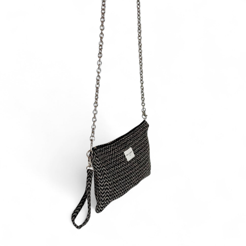 Bolso tipo "Clutch" con asa de cadena de color plata y con asa pequeña en el lateral extraíble para llevar en la muñeca. Con tejido grueso de jacquard con estampado tipo zigzag de color beige y negro. Con forro interior y cremallera en la parte superior. Para su correcto mantenimiento se aconseja lavarlo en frío y no utilizar secadora.
