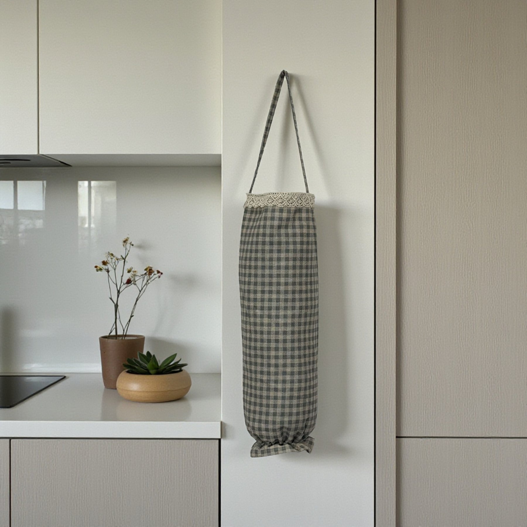 Cuelga bolsas con tira para poder colgarlo cómodamente, confeccionado en tejido fino half-panama 80% algodón y 20% poliéster, con estampado a cuadros azules y gris. Práctico y decorativo, ayuda a mantener el orden en la cocina con un toque alegre y cuidado.