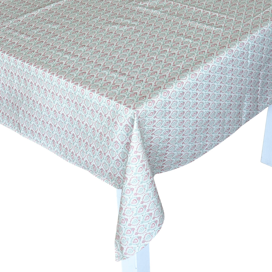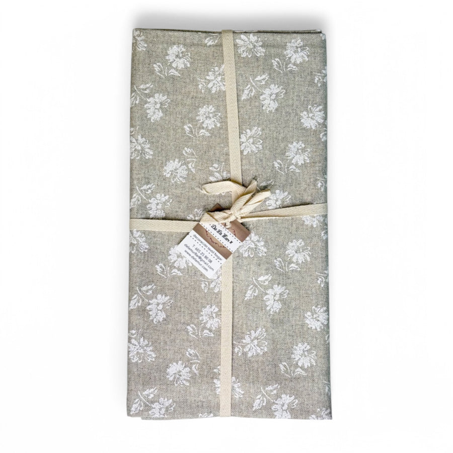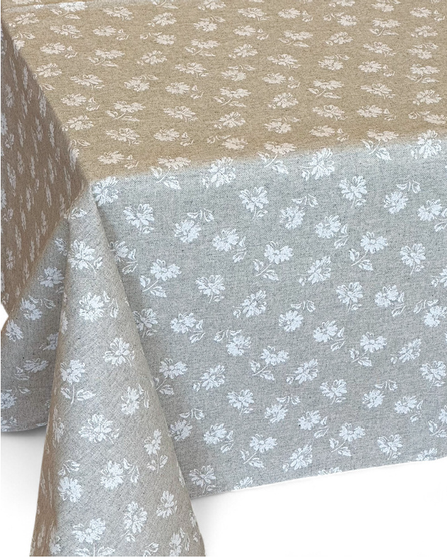 Mantel resinado para mesa. Con tejido resinado con estampado floral de color blanco sobre fondo beige, resistente a manchas y fácil limpieza. Para su correcto mantenimiento se aconseja lavarlo en frío y no utilizar secadora.