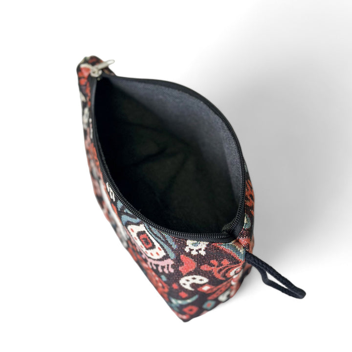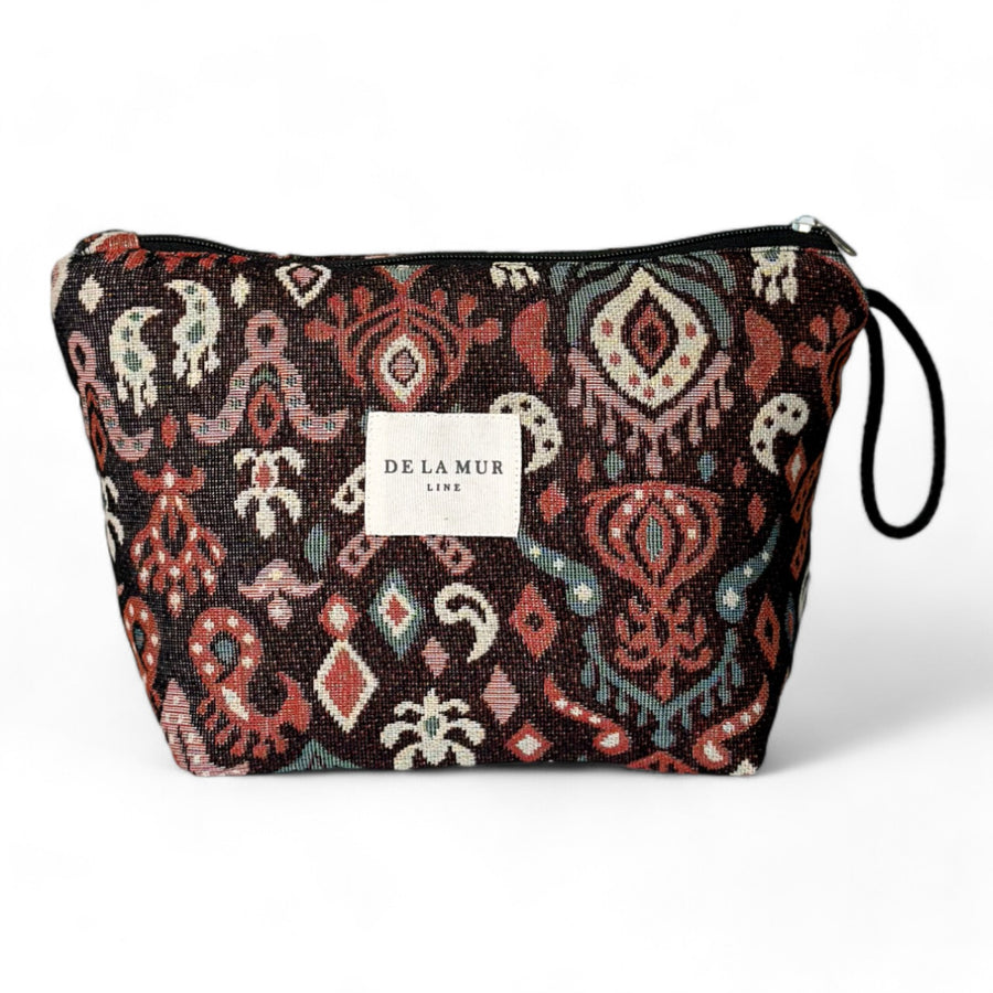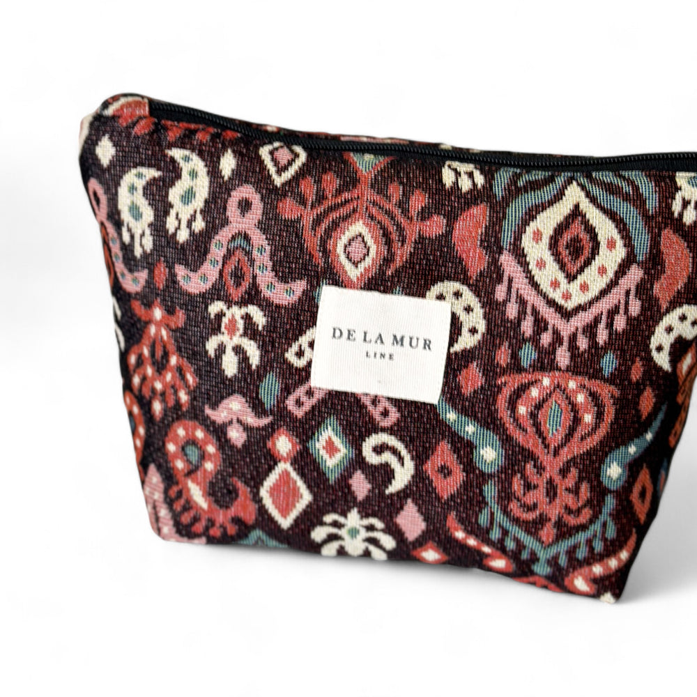 Neceser con cremallera en la parte superior y asa de cordón de color negro en el lateral. Con tejido grueso de jacquard con estampado étnico en tonos granates. Forrado de tejido grueso de color gris en la parte interior. Para su correcto mantenimiento se aconseja lavarlo en frío a mano y no utilizar secadora.