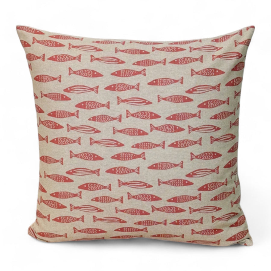 Funda de cojín sin relleno. Combinado con dos tejidos, uno de half-panama con estampado de peces de color teja por una cara, y otro de color beige liso por la otra. Para su correcto mantenimiento se aconseja lavarlo en frío y no utilizar secadora.