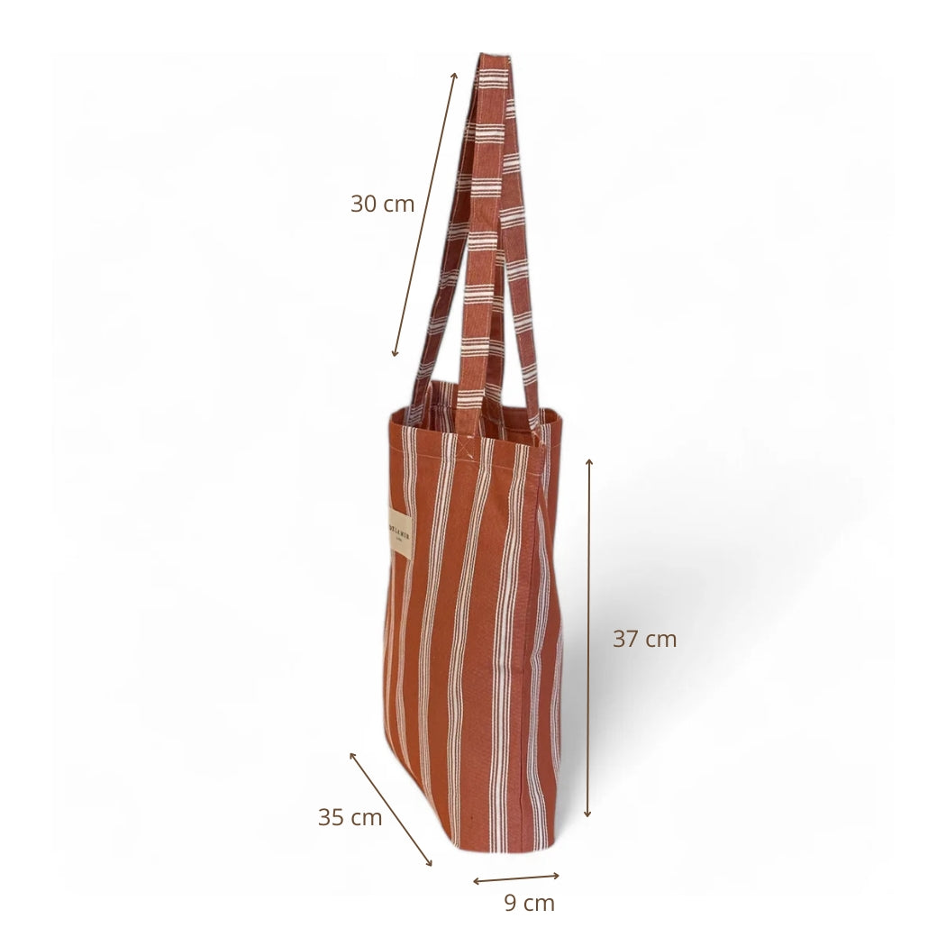 Bolsa "tote bag" con asas para llevar al hombro. Con tejido fino con textura con estampado a rayas de color crudo sobre fondo teja. Para su correcto mantenimiento se aconseja lavarlo en frío y no utilizar secadora.