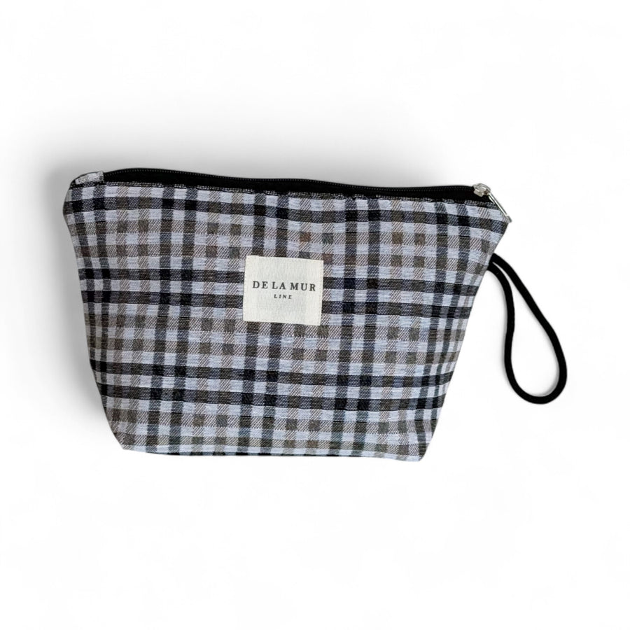 Neceser con cremallera en la parte superior y asa de cordón de color negro en el lateral. Con tejido grueso de jacquard con estampado a cuadros en tono beige y negro. Forrado de tejido grueso de color gris en la parte interior. Para su correcto mantenimiento se aconseja lavarlo en frío a mano y no utilizar secadora.