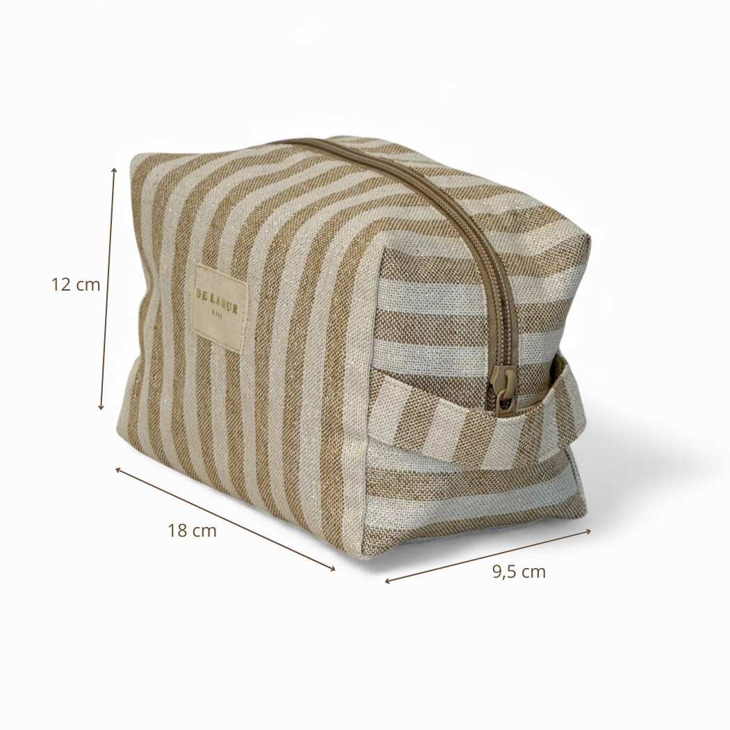 Neceser mediano con cremallera en la parte superior y con asa lateral. Con tejido fino de half-panama 80% algodón y 20% poliéster con estampado a rayas en tono crudo y mostaza con lurex. Etiqueta de marca con lurex dorado. Para su correcto mantenimiento se aconseja lavarlo en frío y no utilizar secadora.