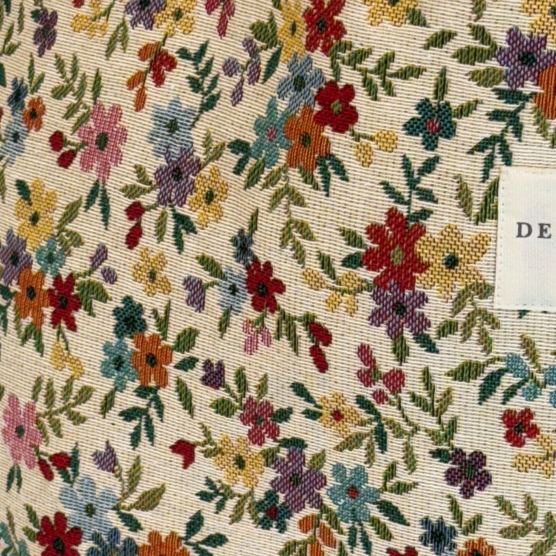 Bolsa "tote bag" con asas para llevar al hombro. Con tejido grueso de jacquard 80% algodón y 20% poliéster con estampado floral sobre fondo beige. Con cremallera en la parte superior. Para su correcto mantenimiento se aconseja lavarlo en frío y no utilizar secadora.