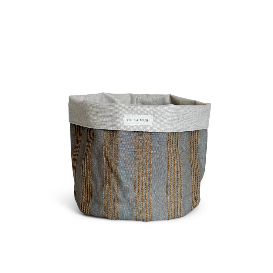 Cesta mediana multiusos. Con tejido grueso con estampado a rayas de chenilla de color anaranjado en el exterior, y tejido resinado en el interior. Para su correcto mantenimiento se aconseja lavarlo en frío y no utilizar la secadora.