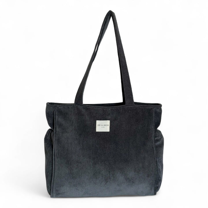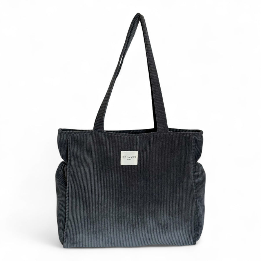 Bolsa mediana con cremallera en la parte superior y asas para llevar al hombro. Con bolsillos laterales. Con tejido grueso de pana de color gris oscuro. Para su correcto mantenimiento se aconseja lavarlo en frío a mano y no utilizar la secadora.