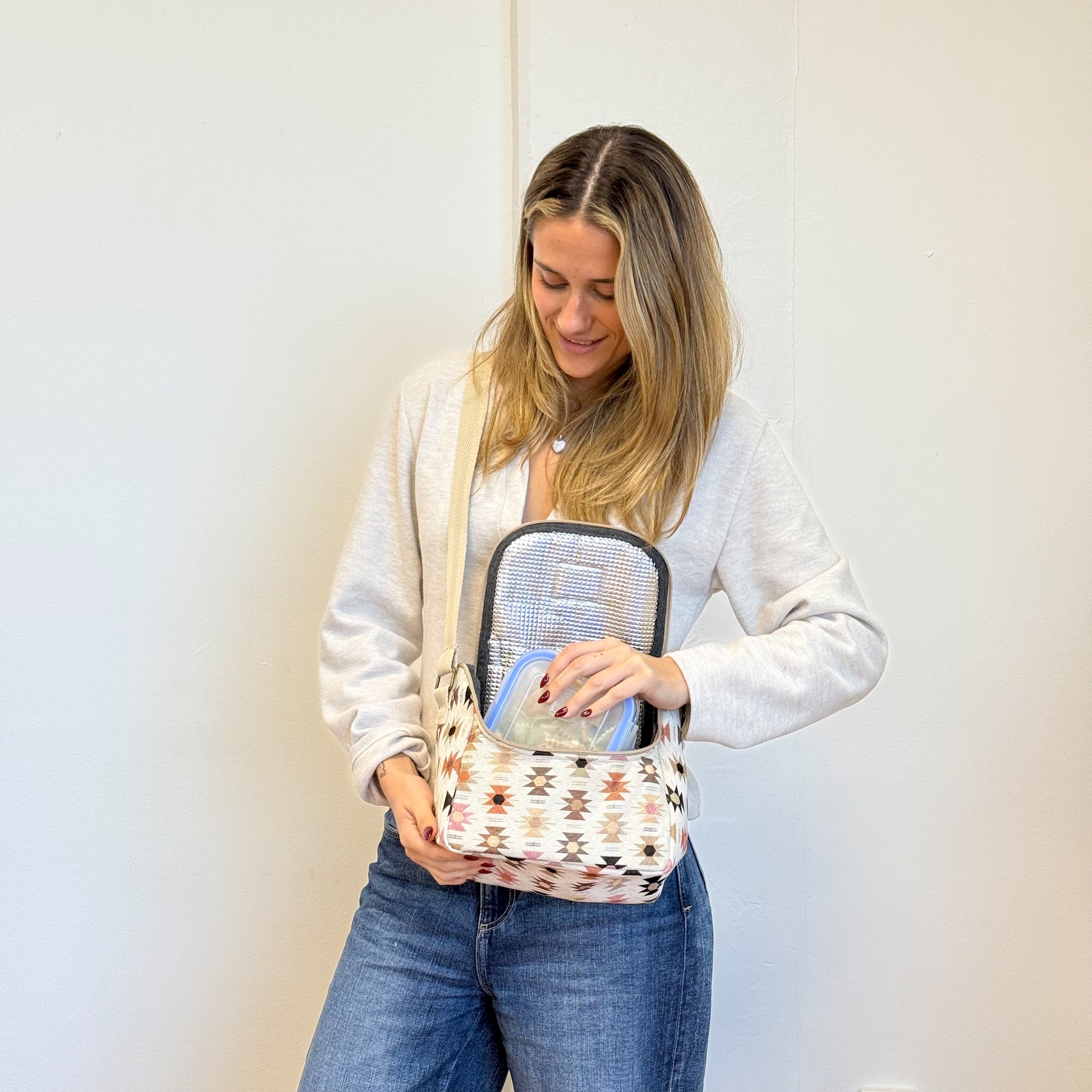 Bolso porta alimentos. Con un tejido grueso de jacquard 80% algodón y 20% poliéster con estampado geométrico en tonos rosas y naranjas en el exterior y capa de material térmico aislante para mantener temperatura en el interior. Con asa para llevar en la mano y asa de cinta de algodón de color beige regulable para llevar cruzado. Para su correcto mantenimiento se aconseja lavarlo en frío y no utilizar secadora.